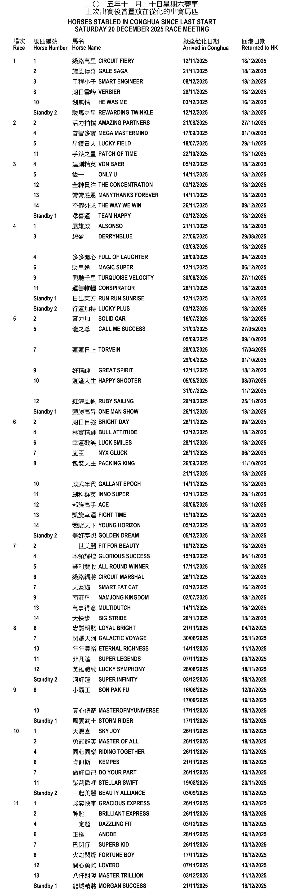 2025年12月20日星期六賽事 – 上次出賽後曾置放在從化的出賽馬匹
