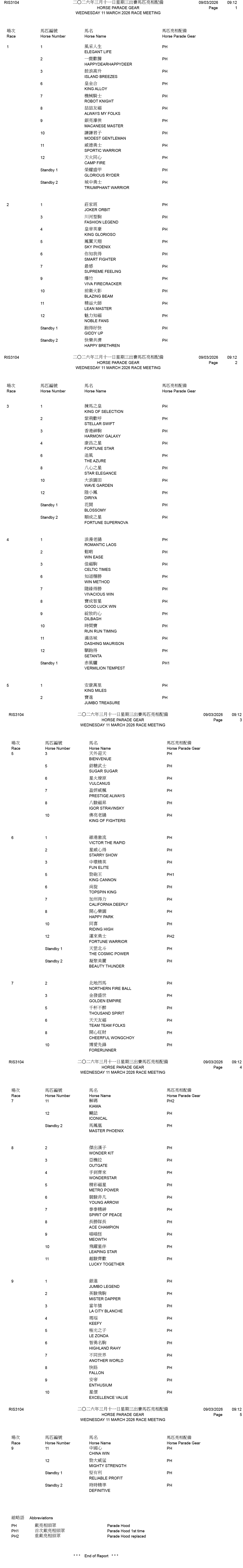 2026年3月11日星期三 - 出賽馬匹亮相配備