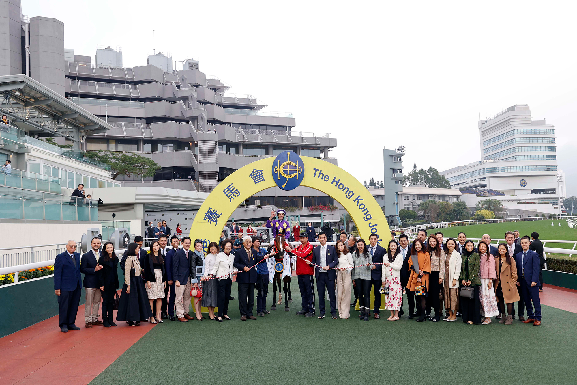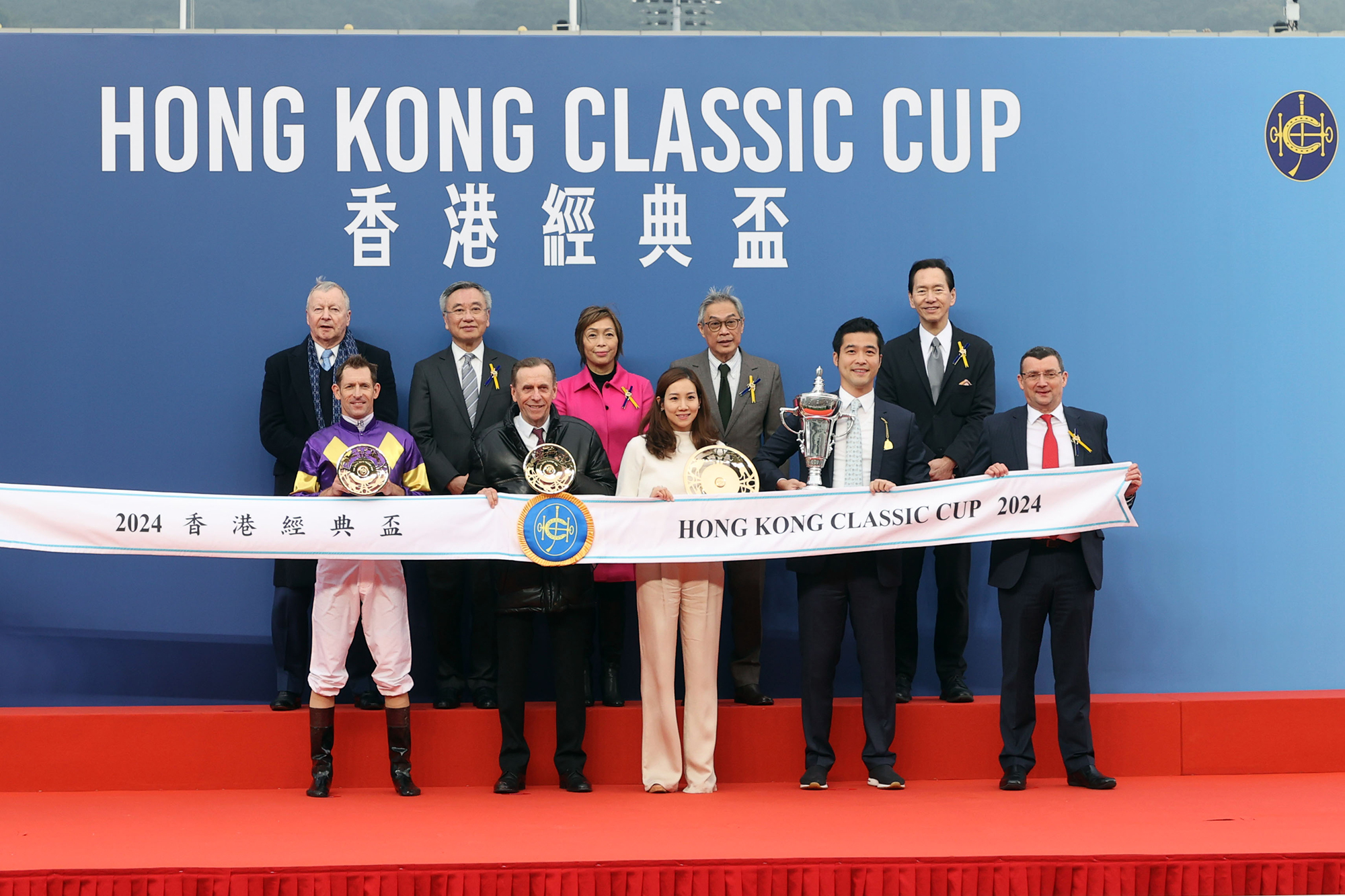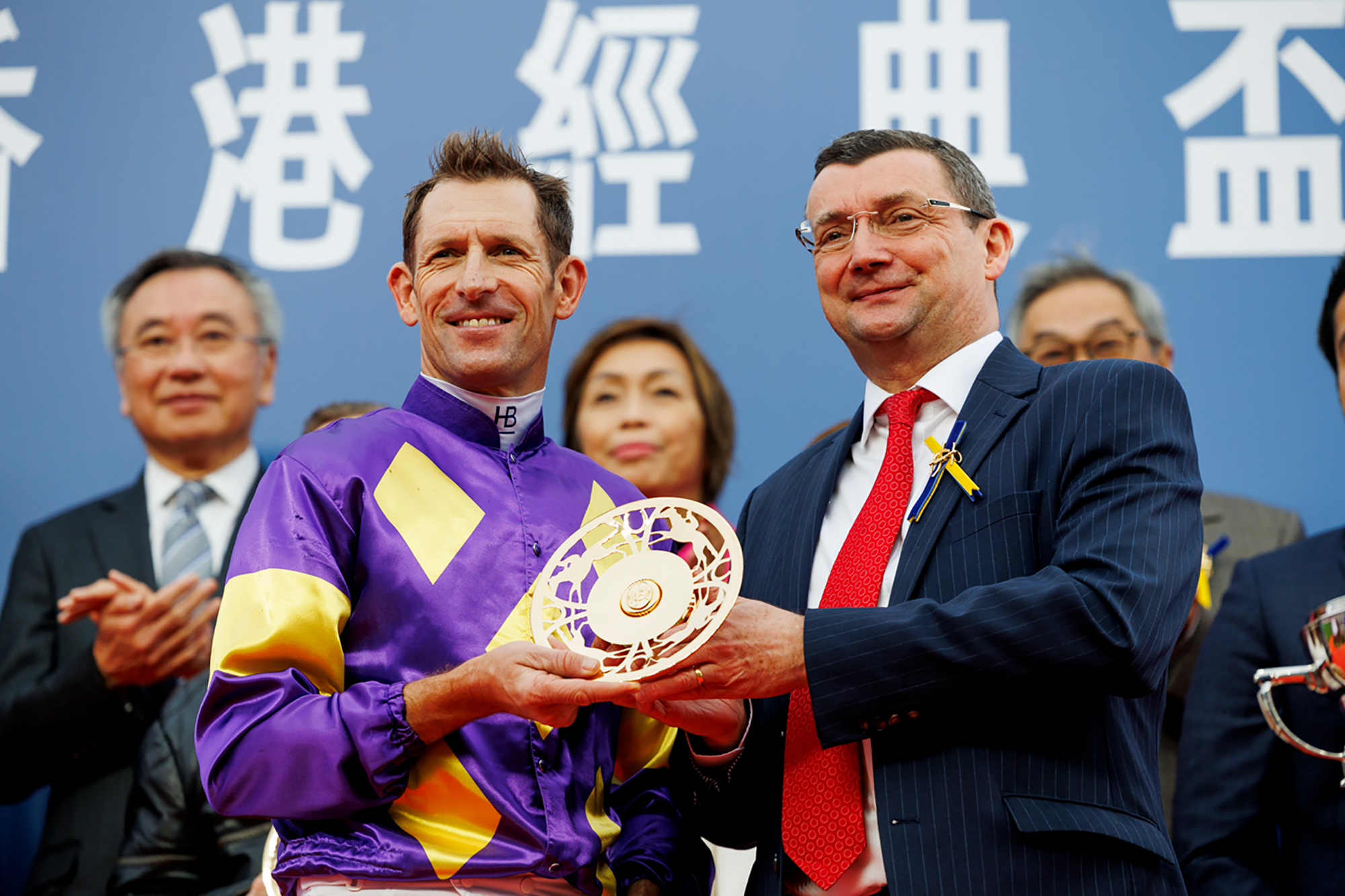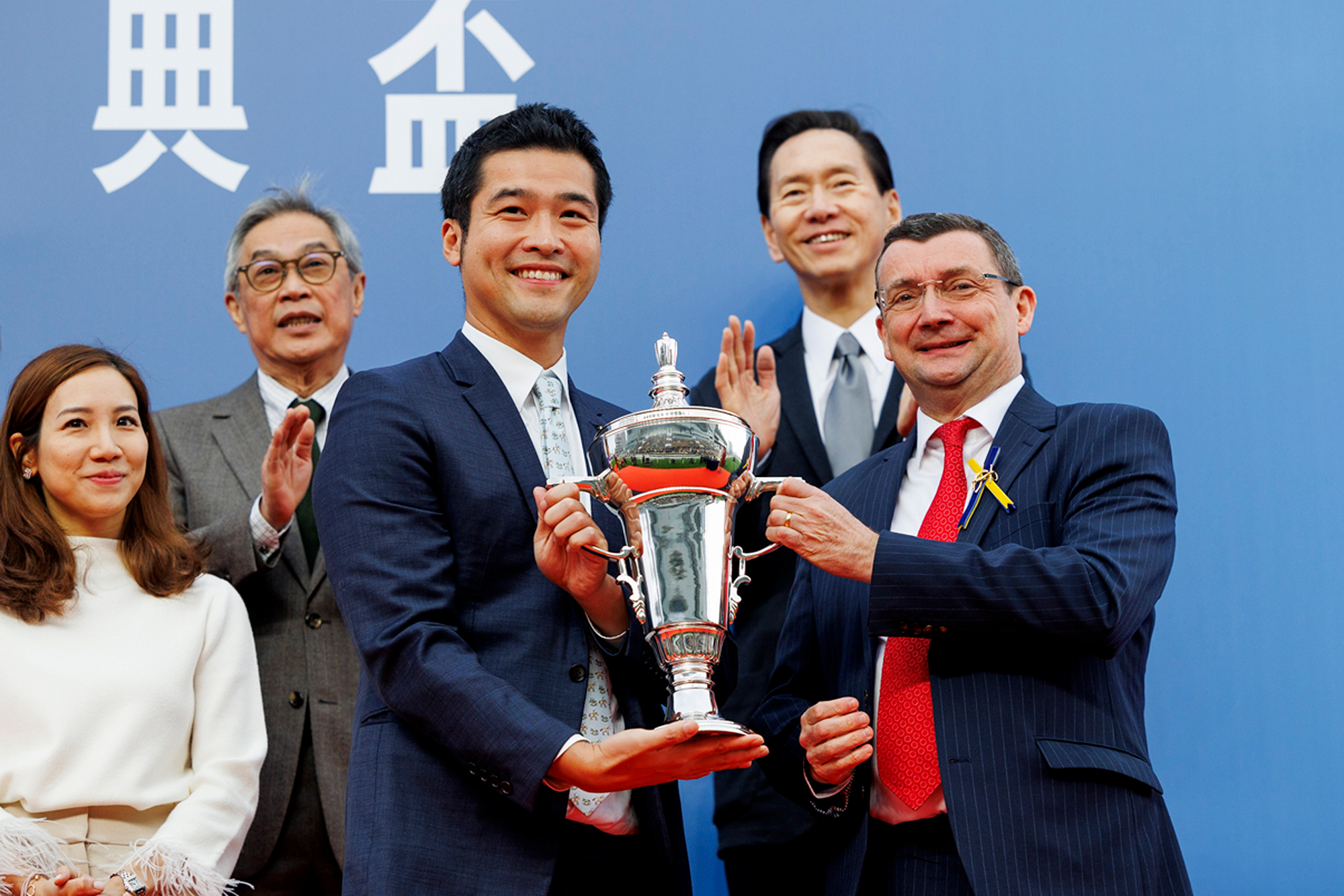 馬會董事韋安祖在頒獎儀式上將香港經典盃獎盃及鍍金碟頒予「驕陽明駒」的馬主榮明棣、練馬師蔡約翰及騎師布文。
