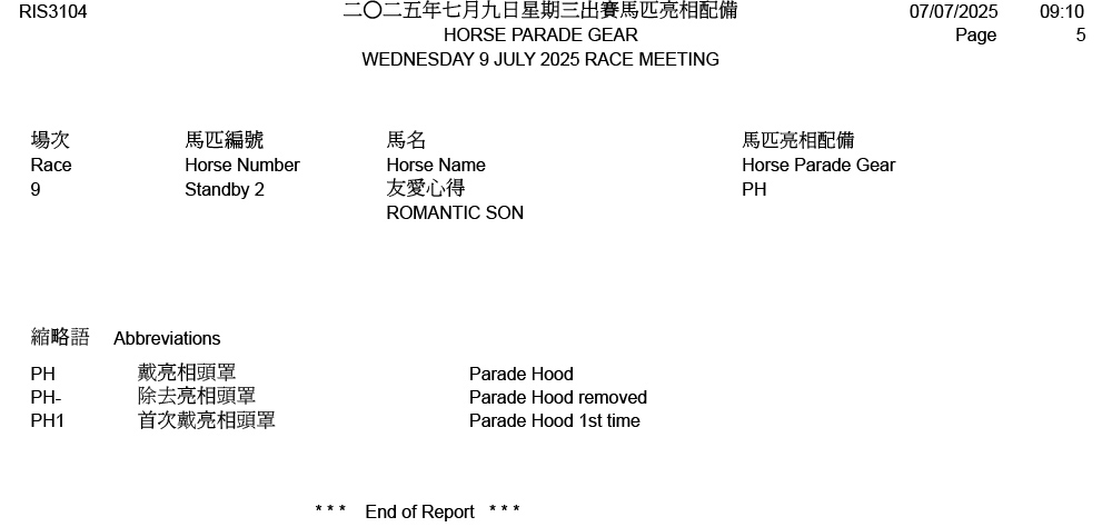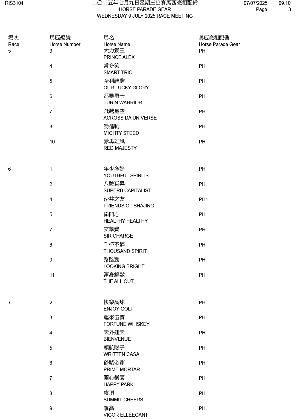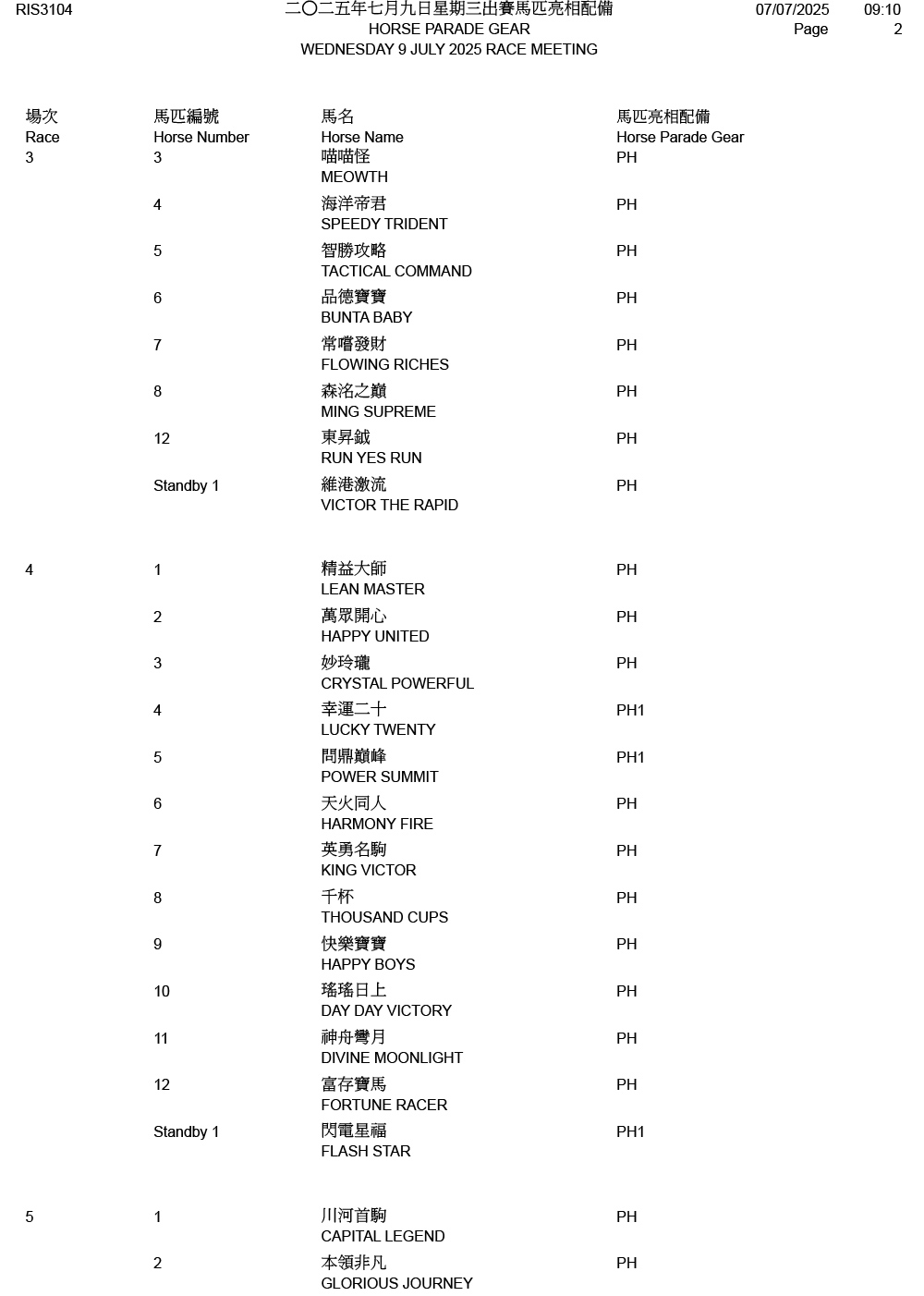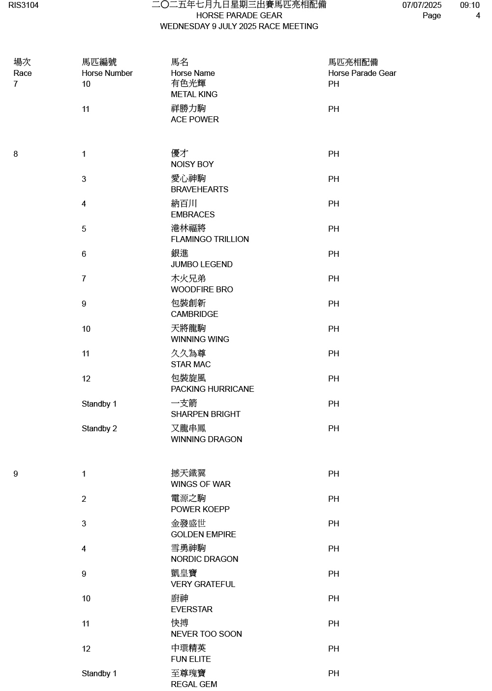2025年7月9日星期三賽事 - 出賽馬匹亮相配備
