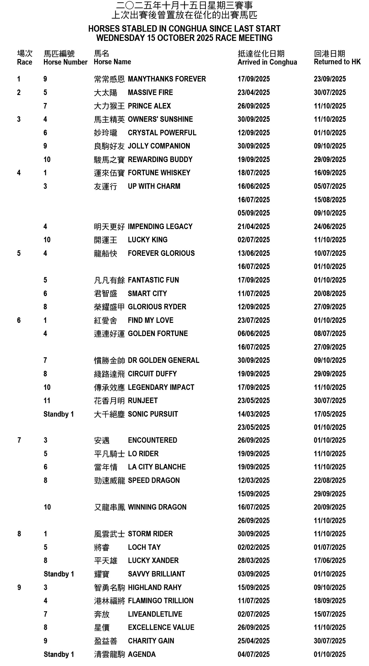 2025年10月15日星期三賽事–上次出賽後曾置放在從化的出賽馬匹