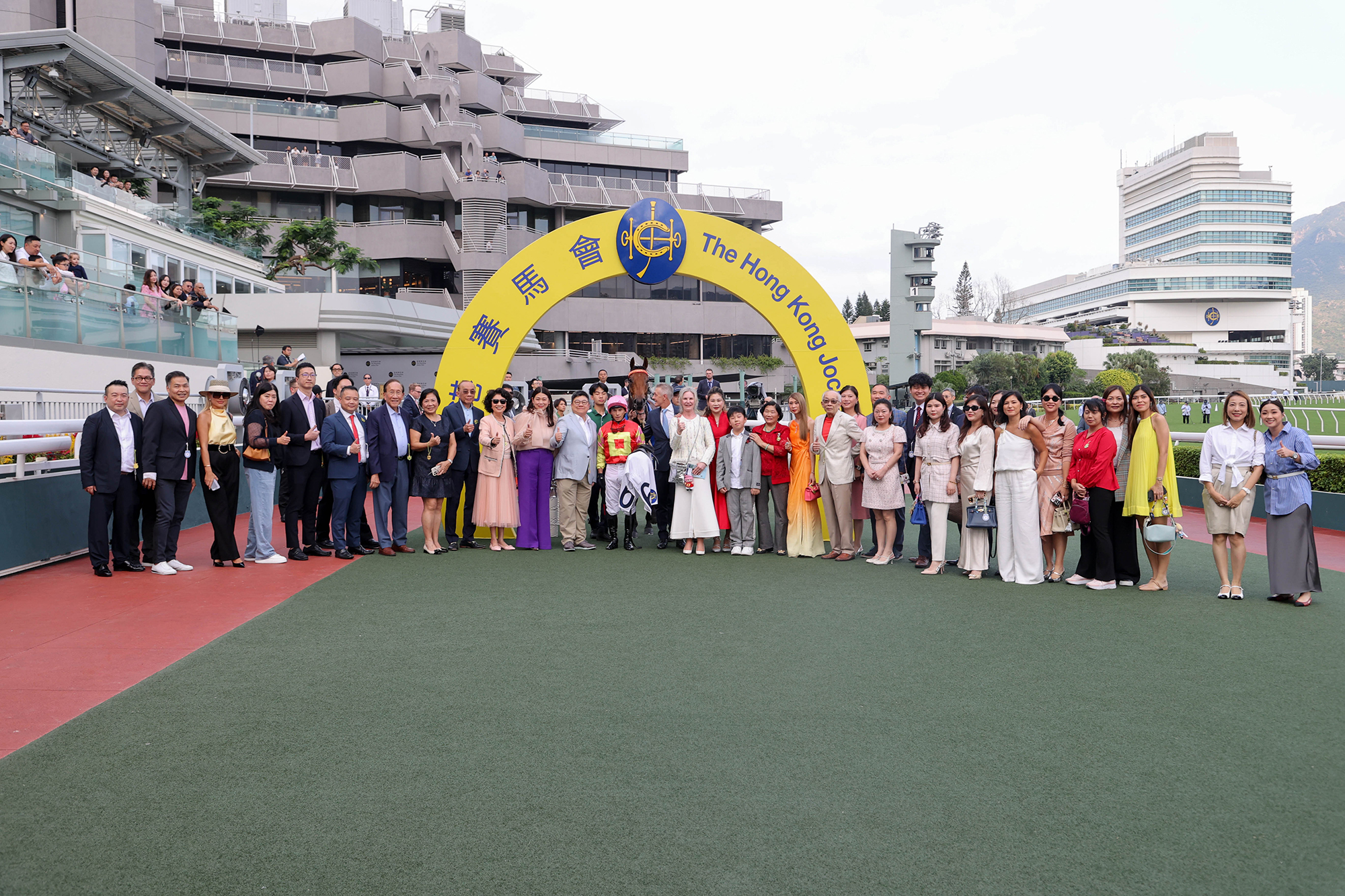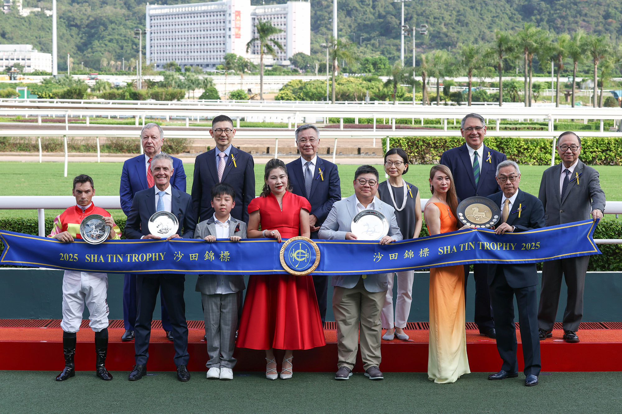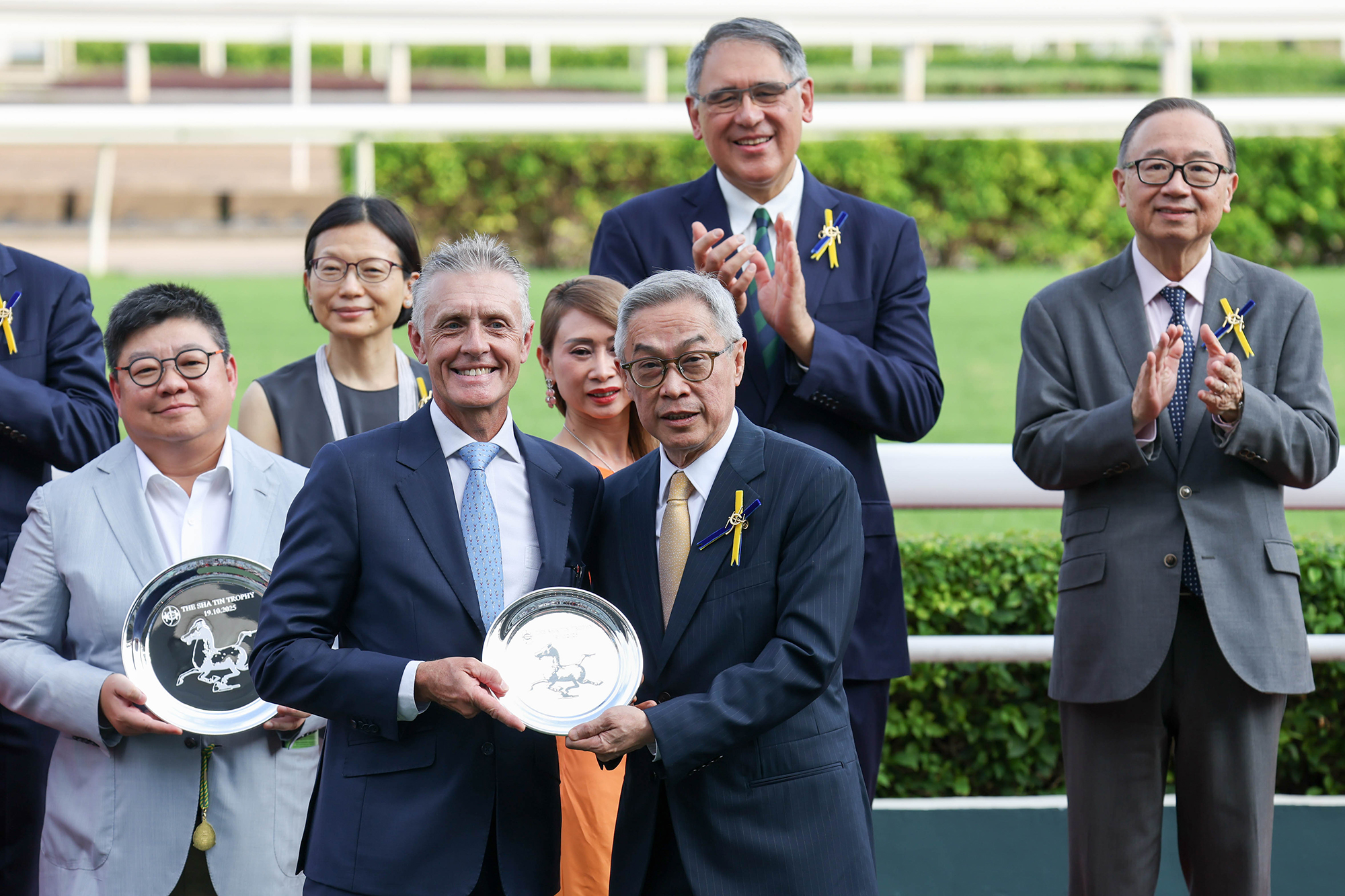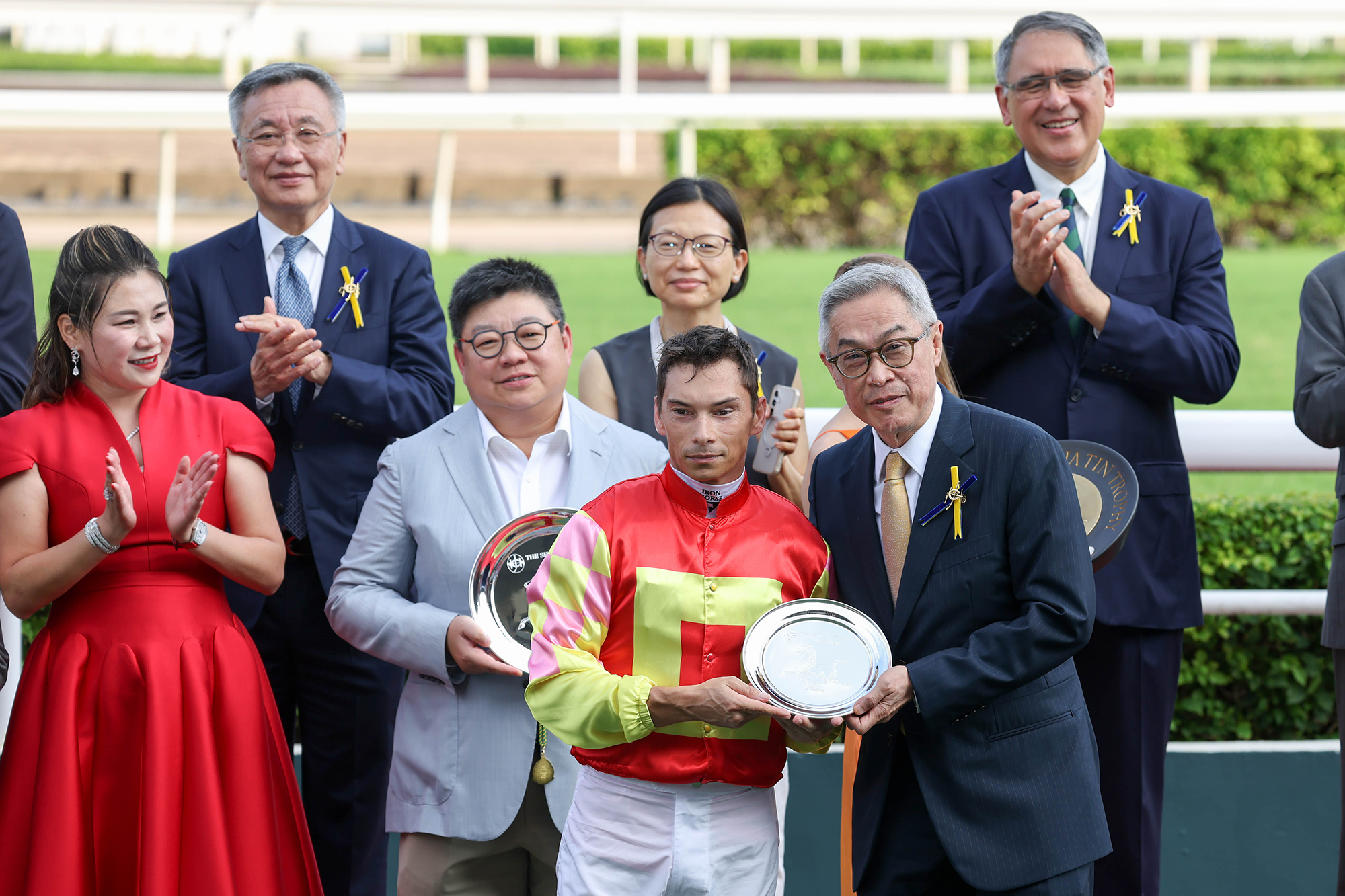 馬會董事胡家驃頒發沙田錦標獎盃及銀碟予「祝願」的馬主唐獻芳與許禮詩、以及頒發銀碟予練馬師廖康銘及騎師巴度。