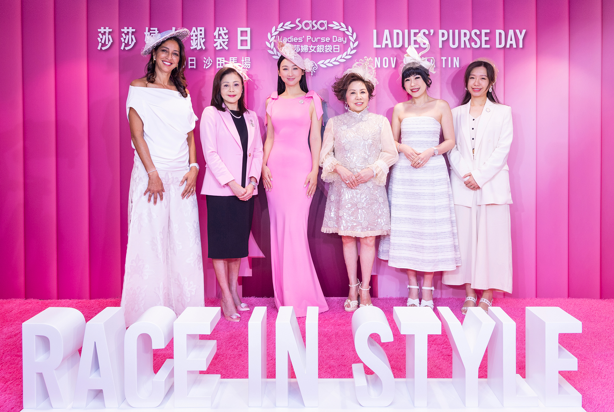 (左起) 香港賽馬會賽馬市場部主管盛雅佩小姐、香港賽馬會會員及客戶事務執行總監鄺學苑女士、「莎莎婦女銀袋日2025」形象大使高海寧小姐、莎莎國際控股有限公司副主席兼執行董事郭羅桂珍博士,銅紫荊星章,太平紳士及莎莎國際控股有限公司執行董事陳郭詩慧女士,榮譽勳章,太平紳士及帽飾設計師Phoebe Leung於「莎莎婦女銀袋日2025」記者招待會上合照。