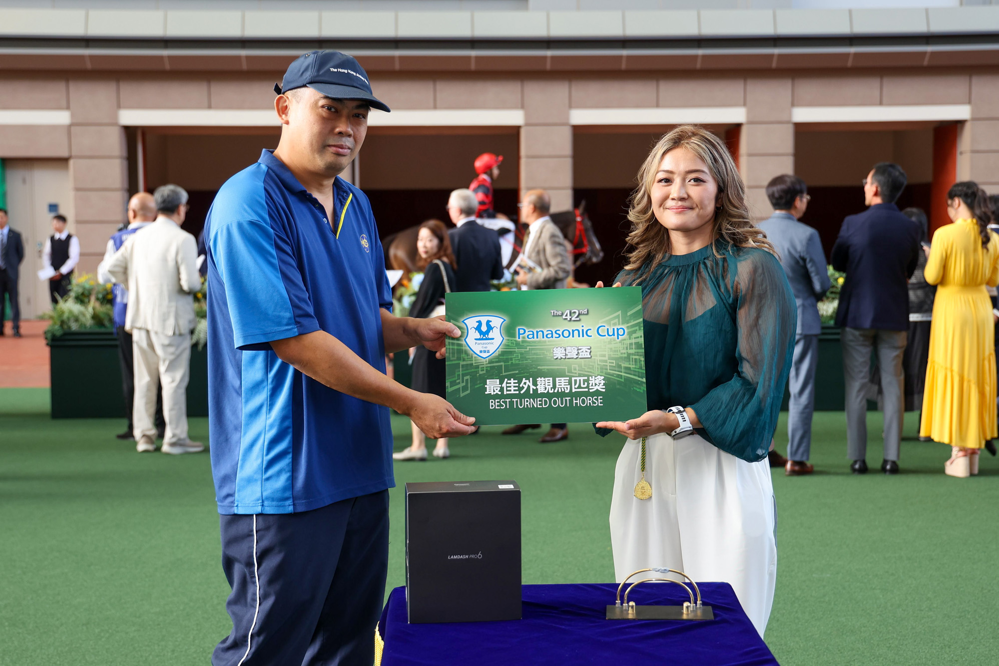 「精英雄心」奪得樂聲盃最佳外觀馬匹獎,信興電器貿易有限公司Jasmie Mong小姐(右)將最佳外觀馬匹獎及Panasonic LAMDASH 電鬚刨一部頒發予負責照料該駒的馬房助理。