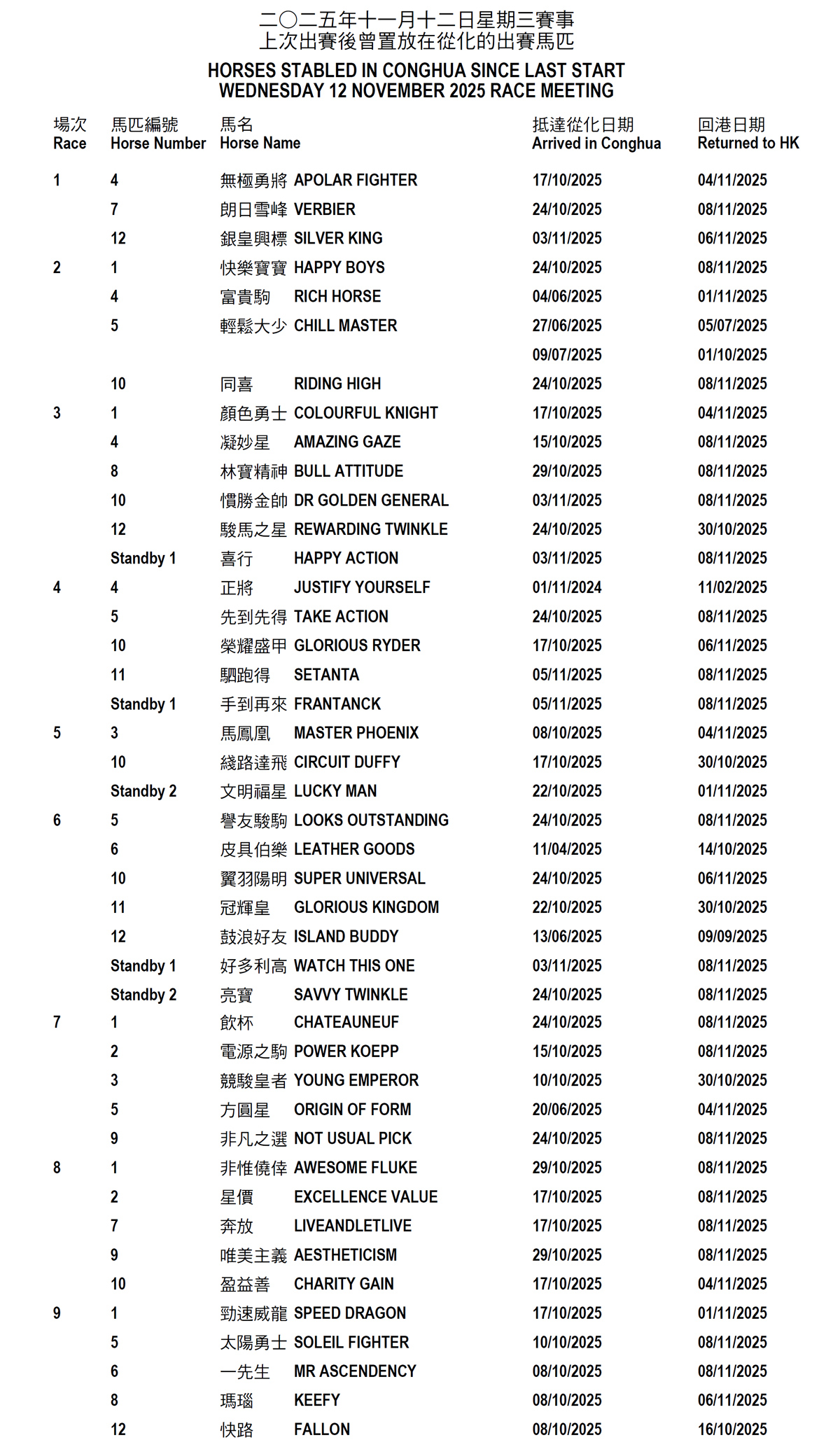 2025年11月9日星期日賽事 –上次出賽後曾置放在從化的出賽馬匹