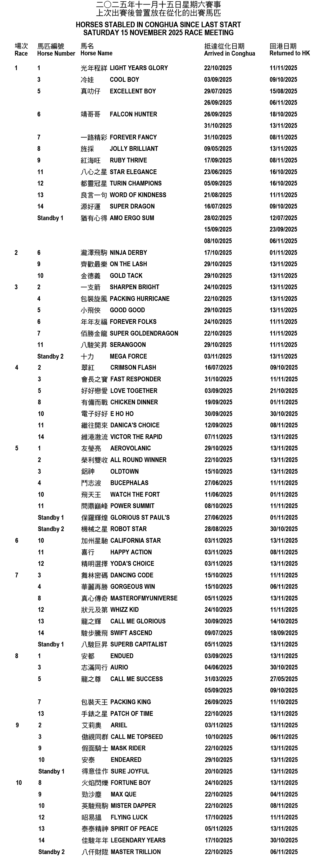 2025年11月15日星期六賽事–上次出賽後曾置放在從化的出賽馬匹