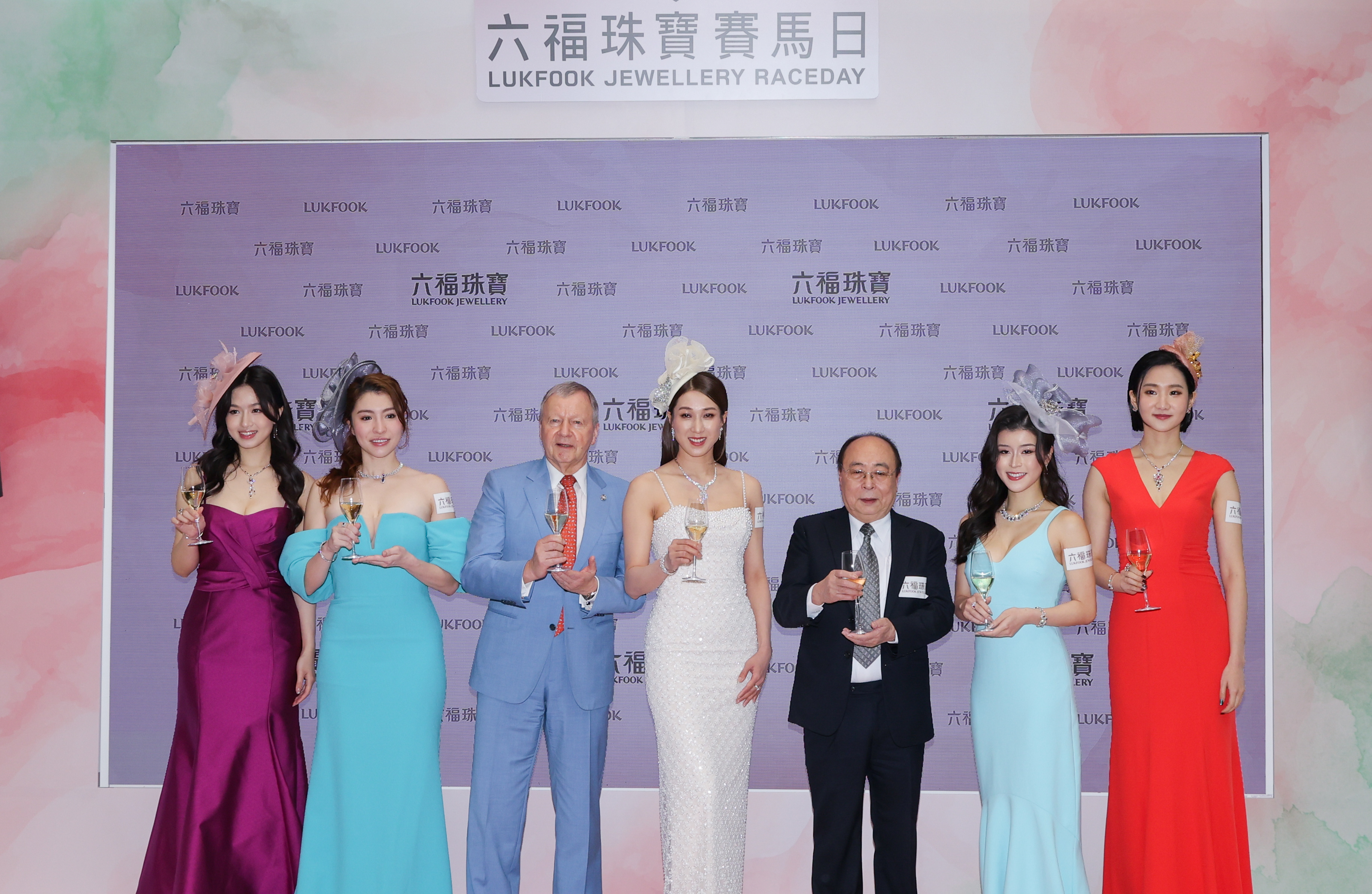 一眾嘉賓在馬會廂房為「六福珠寶賽馬日」主持祝酒儀式,預祝活動圓滿成功。左起:2025友誼小姐及最上鏡小姐李尹嫣、2025香港小姐亞軍施宇琪、香港賽馬會行政總裁應家柏、著名影星及國際華裔小姐冠軍鍾嘉欣、六福集團主席兼行政總裁黃偉常、2025香港小姐冠軍陳詠詩、2025香港小姐季軍袁文靜。