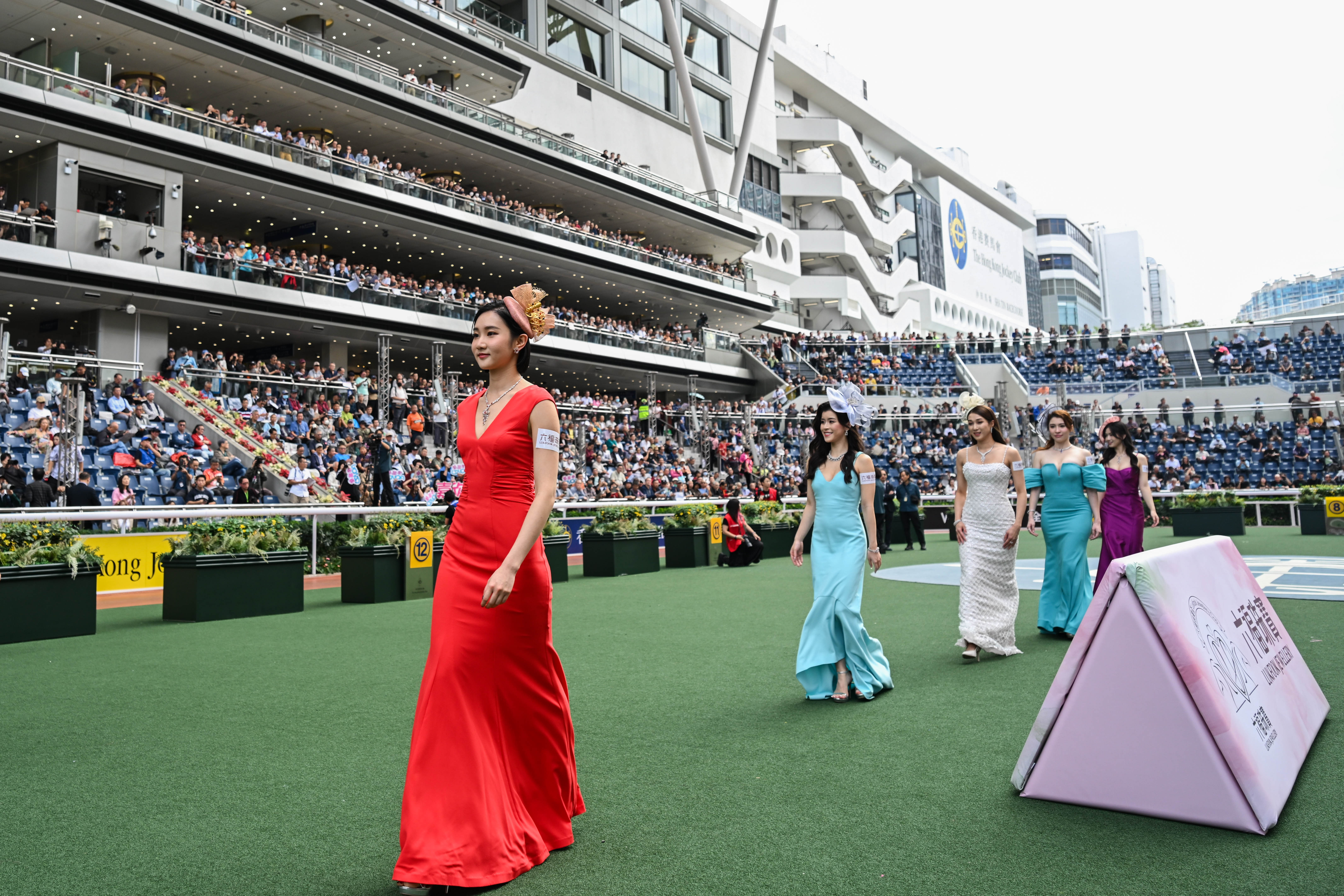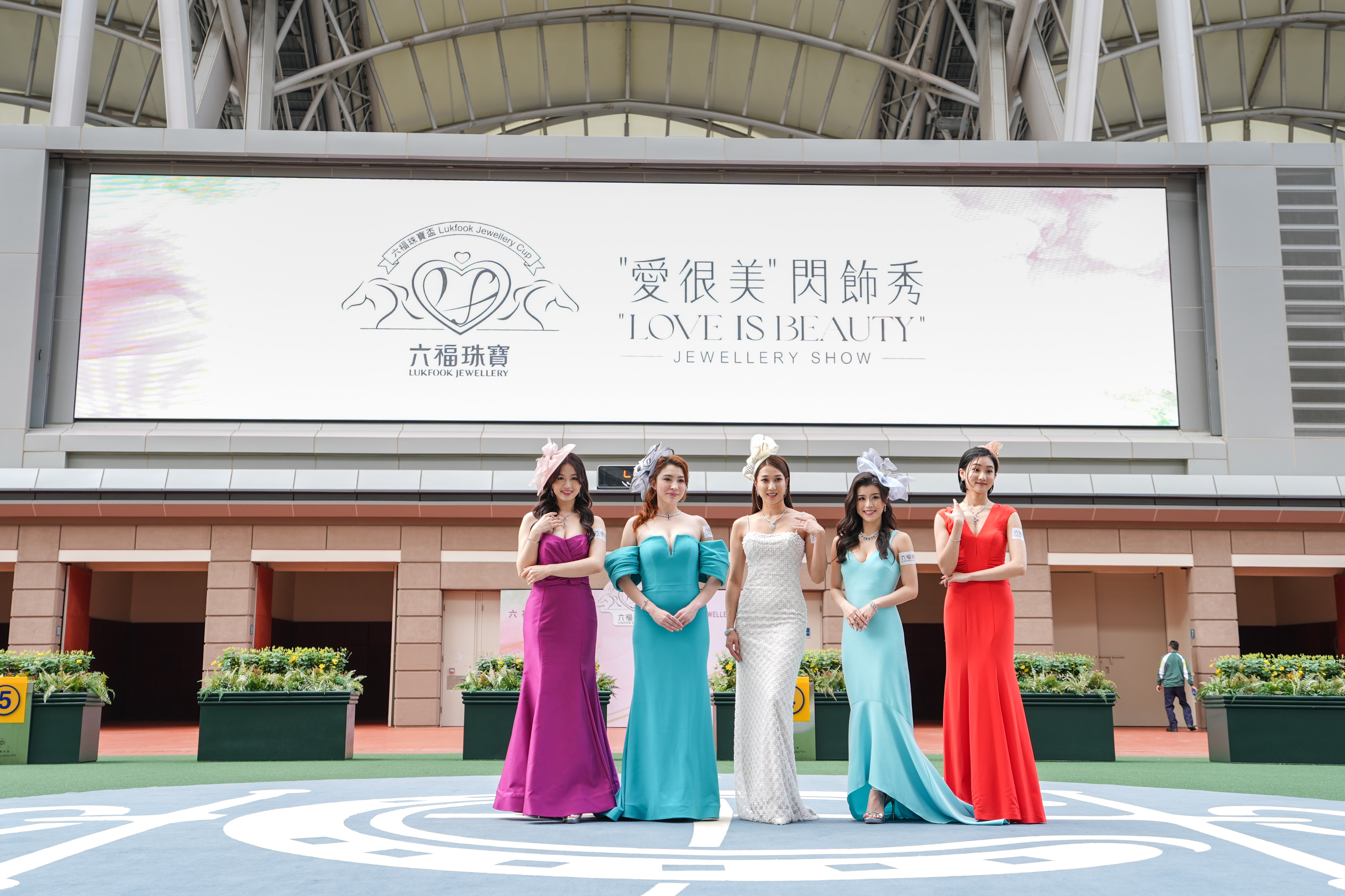 一眾模特兒在馬匹亮相圈演繹「愛很美」時尚閃飾秀,展示六福珠寶多款璀璨奪目的鑽飾。