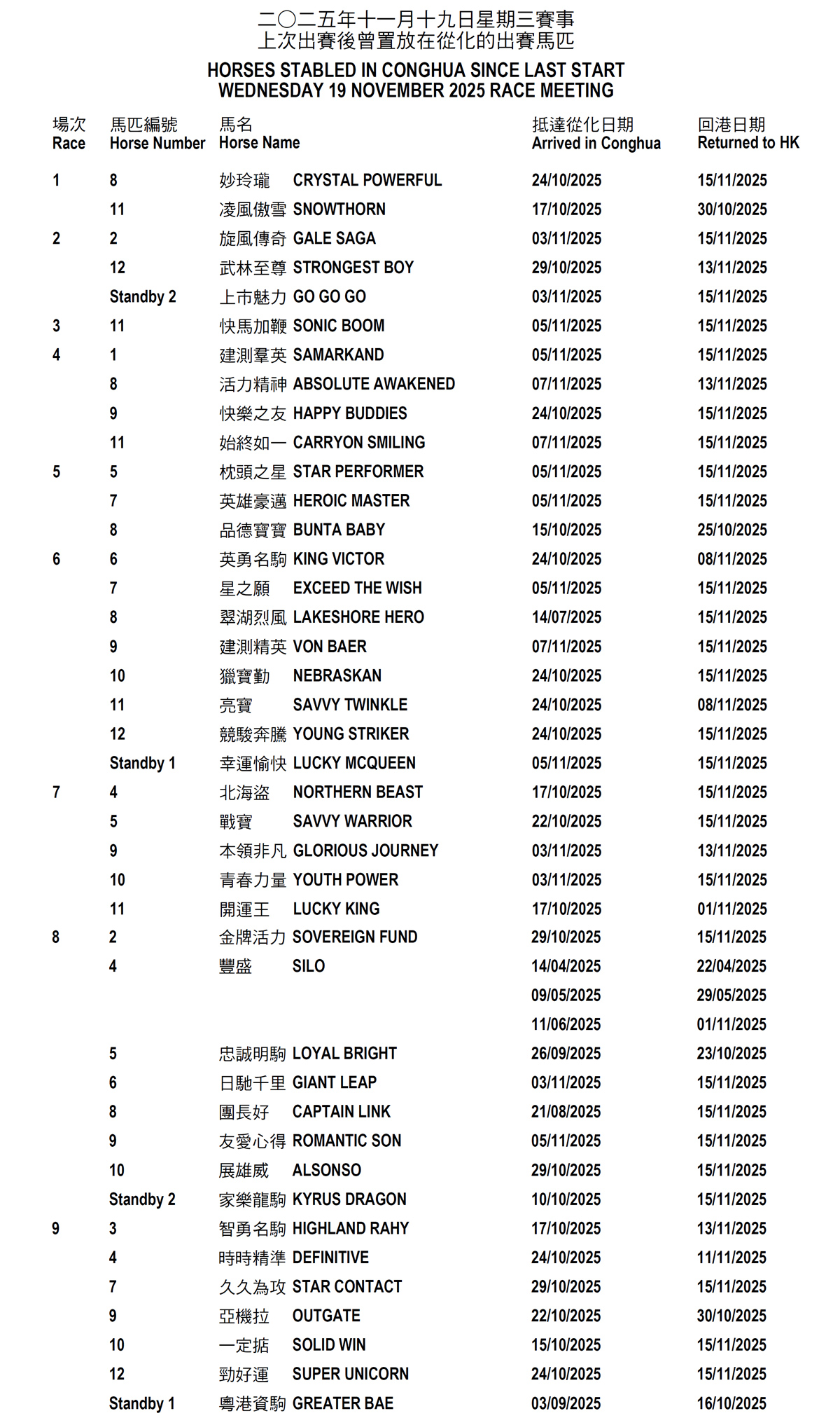 2025年11月19日星期三賽事 – 上次出賽後曾置放在從化的出賽馬匹