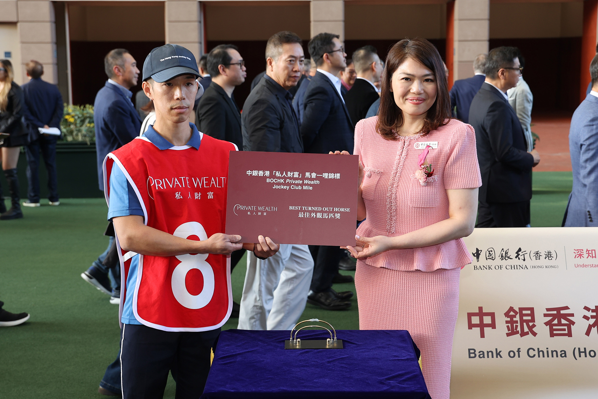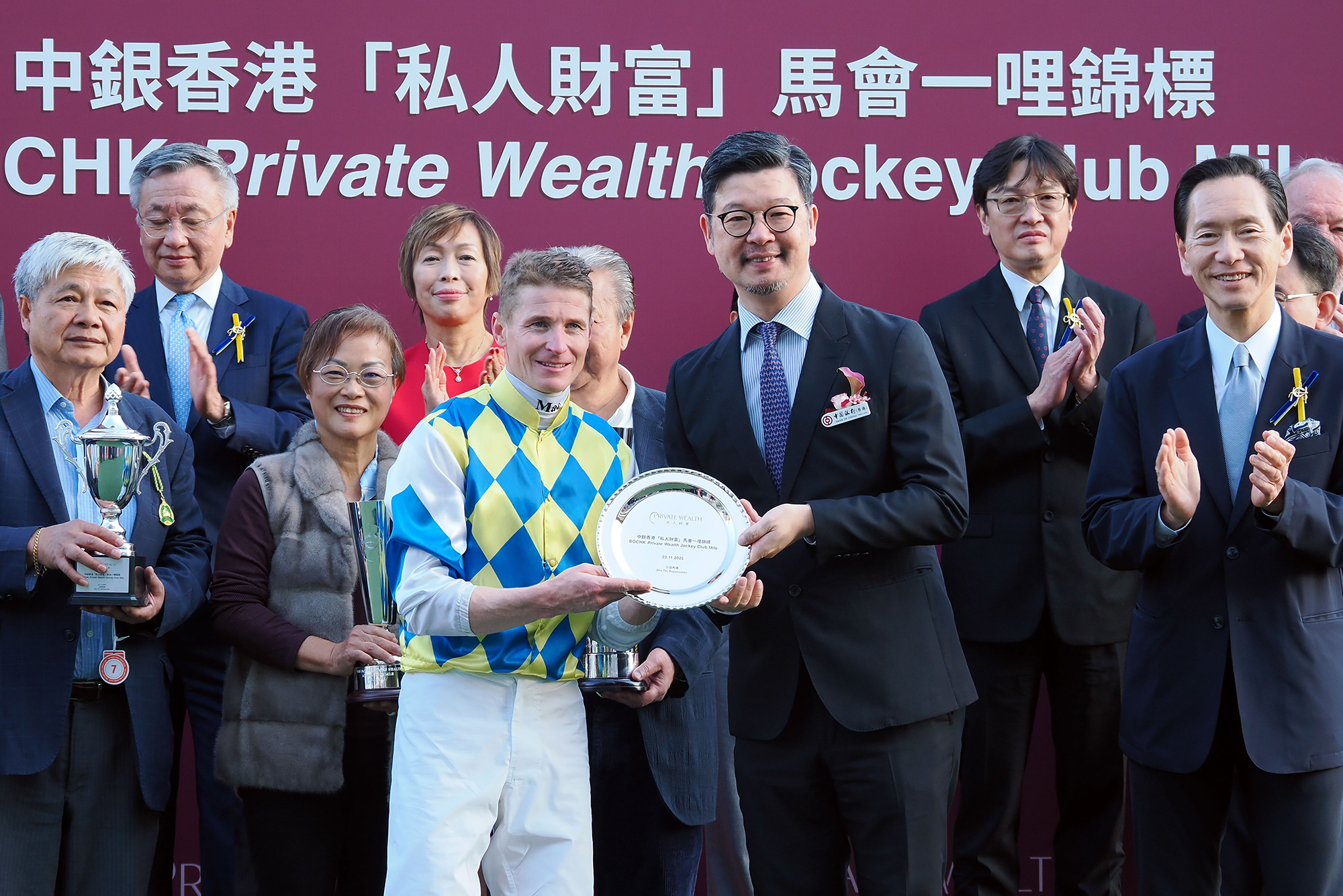 馬會董事陳智思將中銀香港「私人財富」馬會一哩錦標冠軍獎盃,頒予「錶之銀河」的馬主楊建文。勝出馬匹的馬主代表、練馬師伍鵬志及騎師麥道朗各獲贈小型獎盃一座。