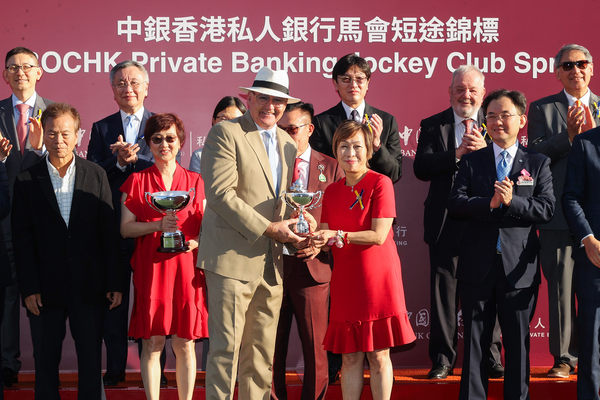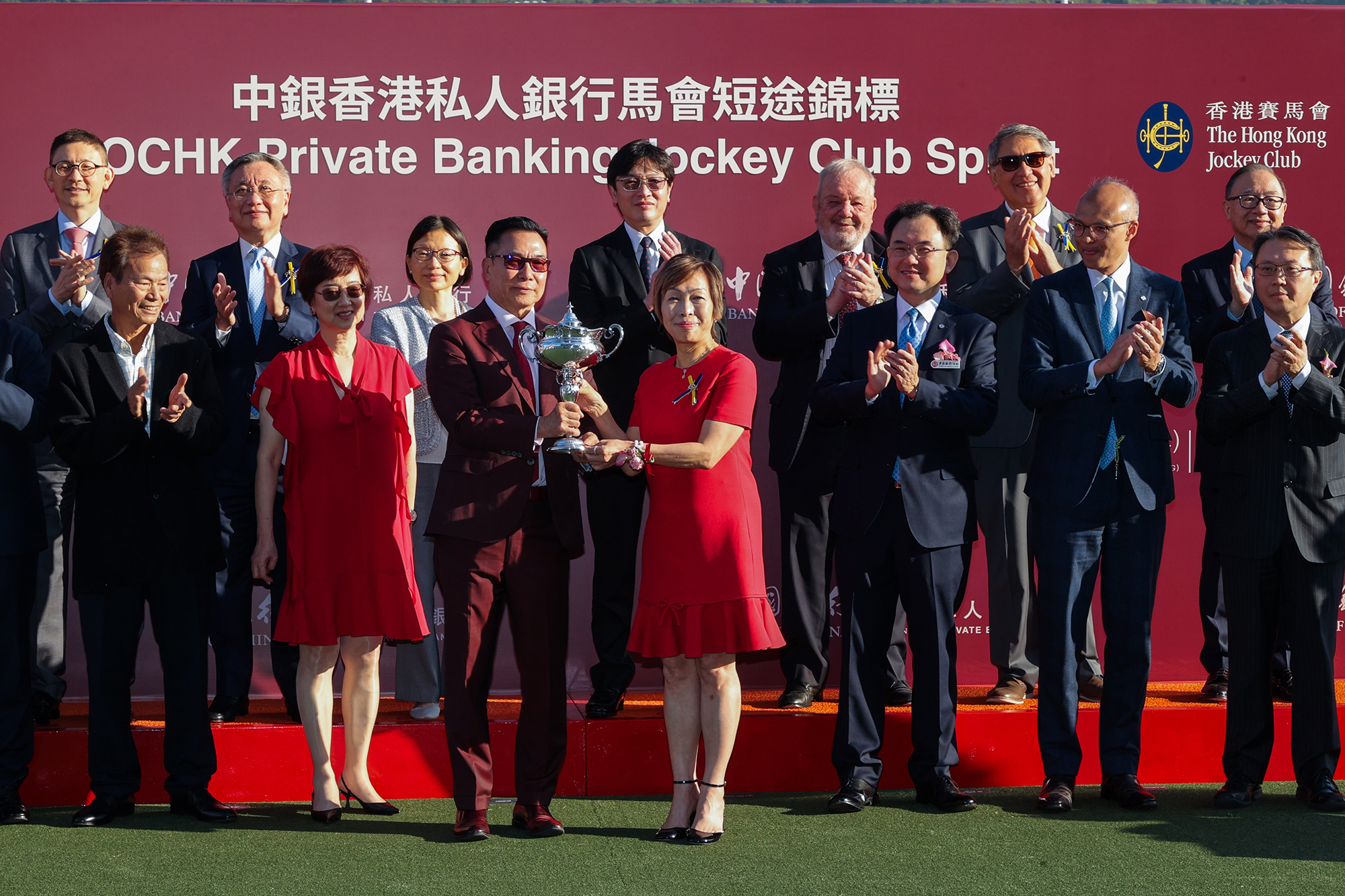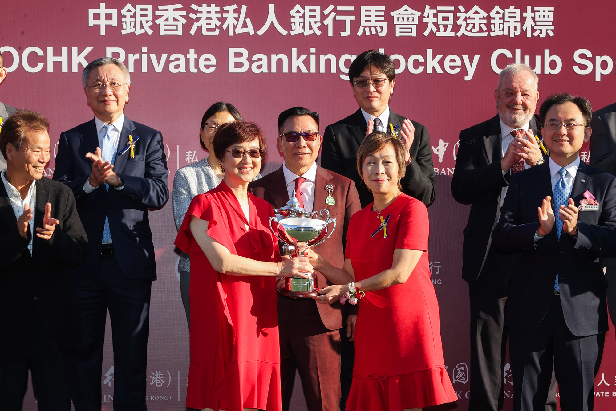 馬會董事龔楊恩慈將中銀香港私人銀行馬會短途錦標獎盃,頒予「嘉應高昇」的馬主嘉應團體的代表。勝出馬匹的馬主代表、練馬師大衛希斯及騎師潘頓各獲贈小型獎盃一座。