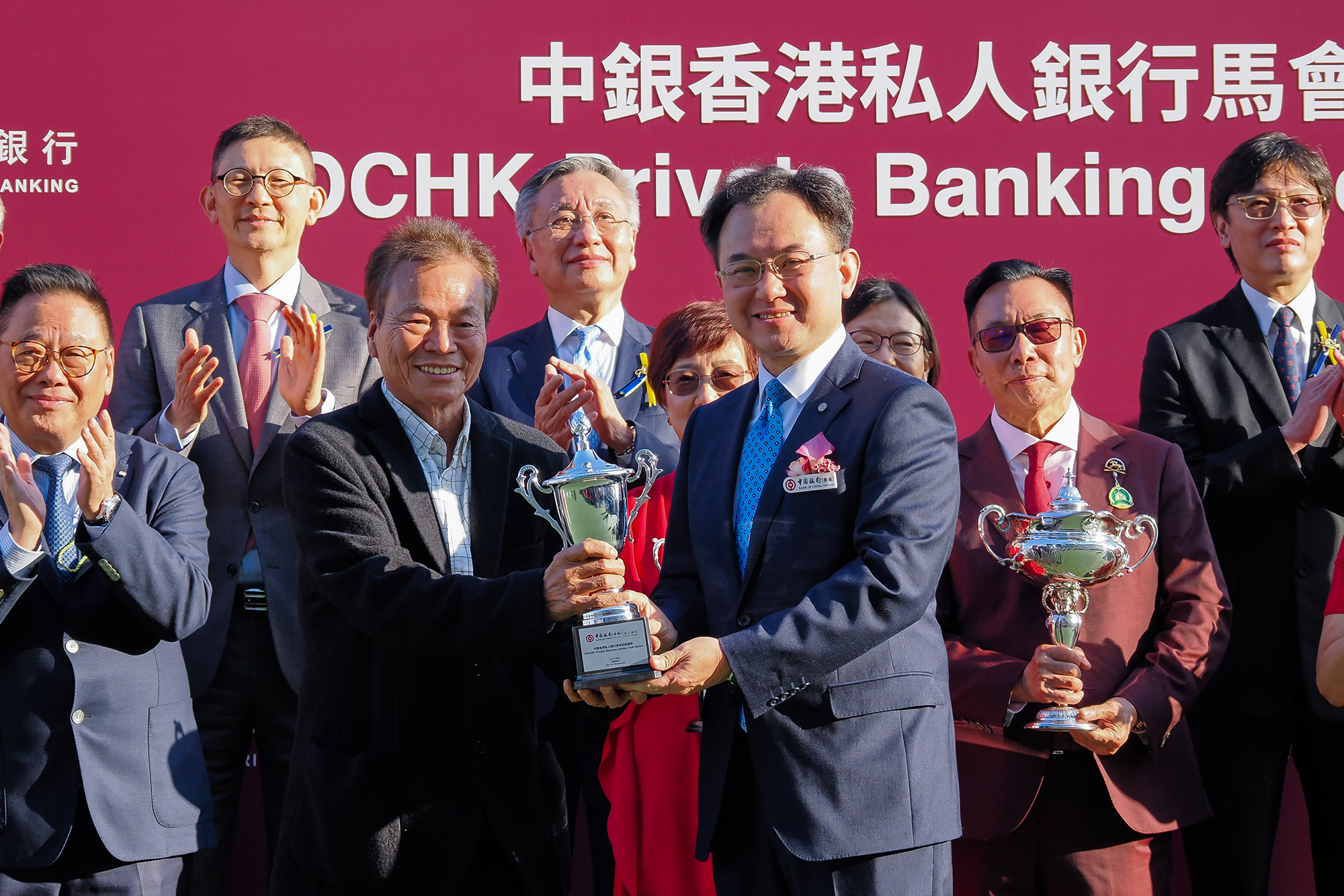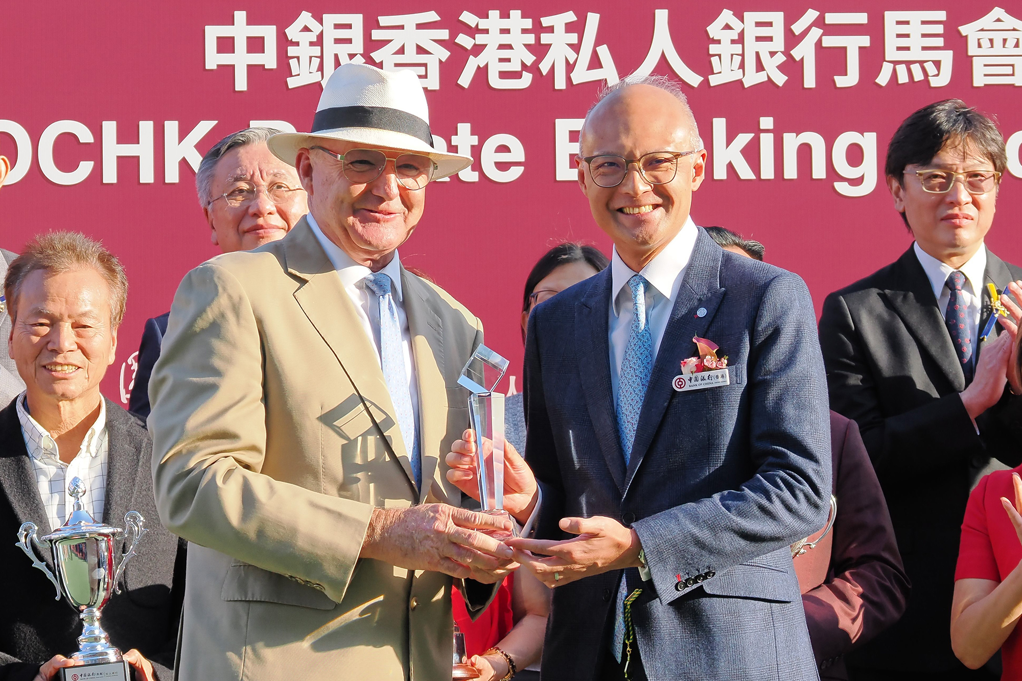 中國銀行(香港)有限公司私人銀行總經理甘宇文頒發水晶獎座予「嘉應高昇」的練馬師大衛希斯。