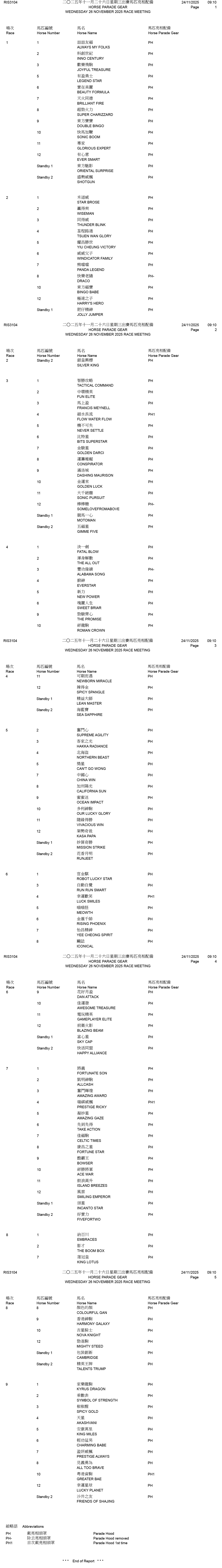 2025年11月19日星期三賽事 - 出賽馬匹亮相配備