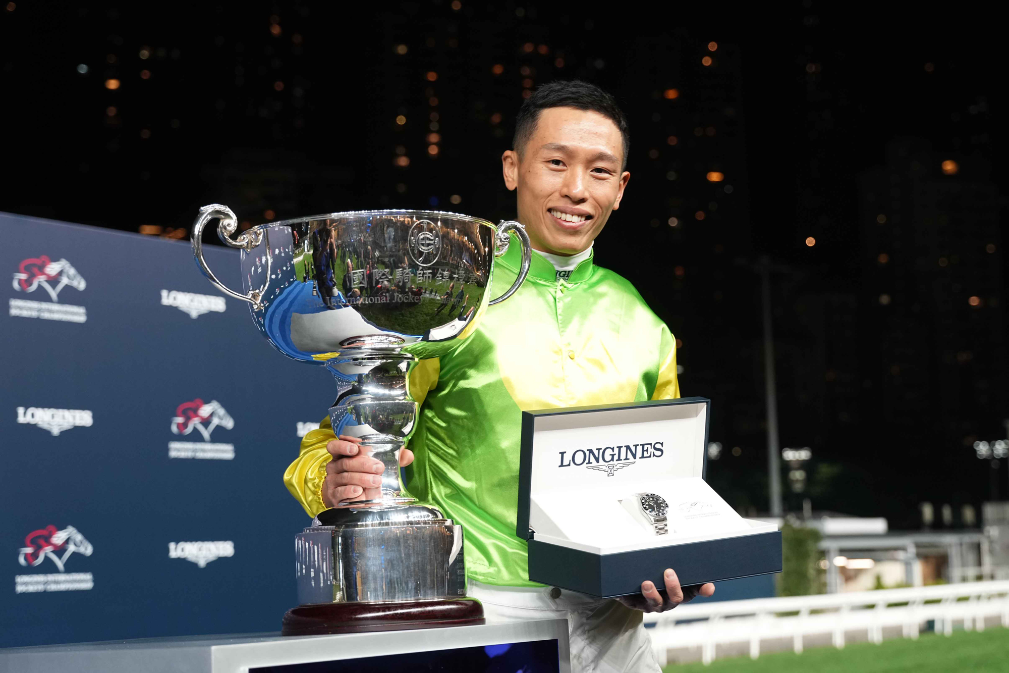 何澤堯於2023年慶祝勇奪浪琴國際騎師錦標賽冠軍。