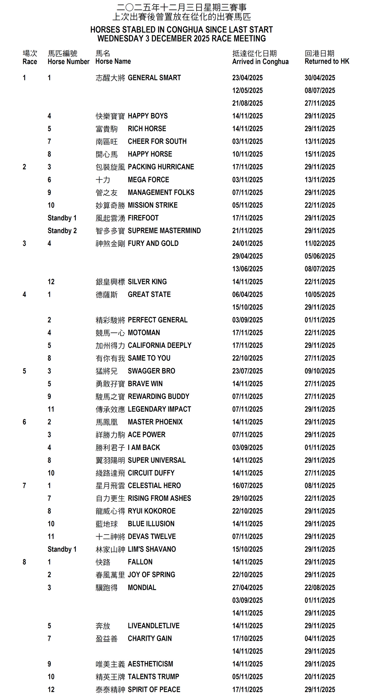 2025年12月3日星期三賽事 – 上次出賽後曾置放在從化的出賽馬匹