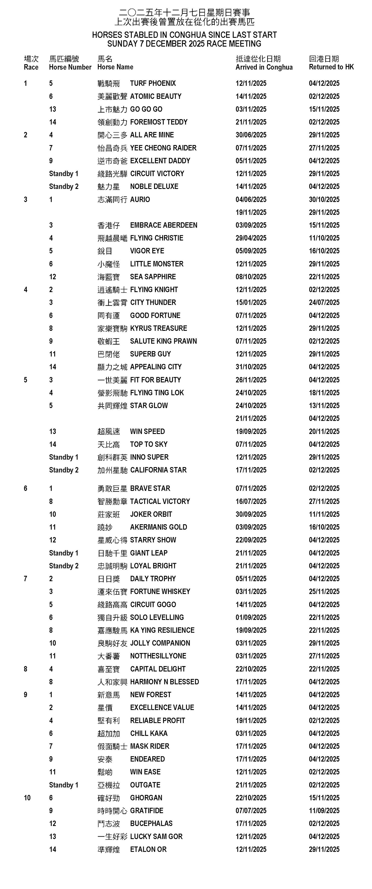 2025年12月7日星期日賽事–上次出賽後曾置放在從化的出賽馬匹