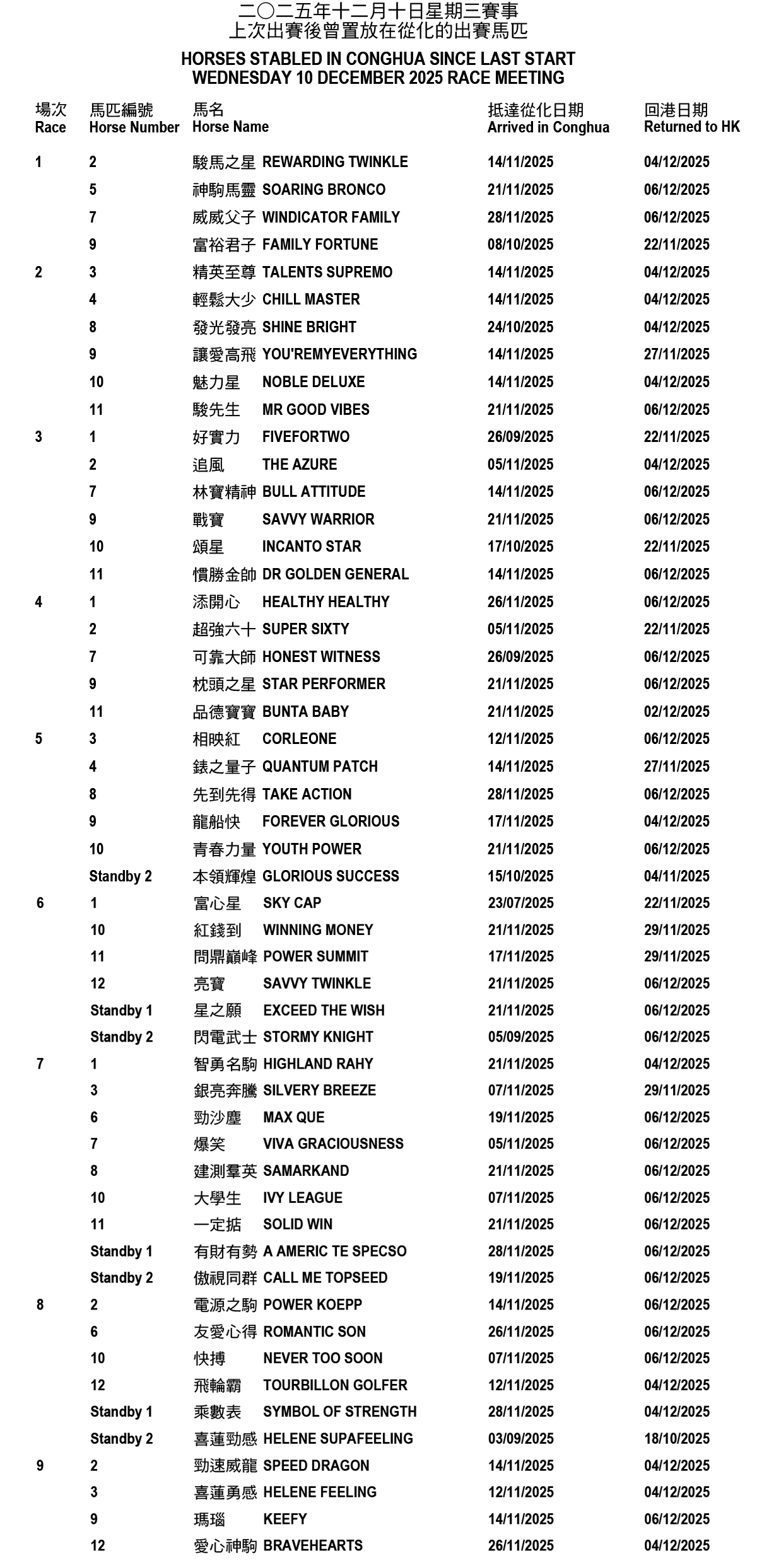 2025年12月10日星期三賽事–上次出賽後曾置放在從化的出賽馬匹