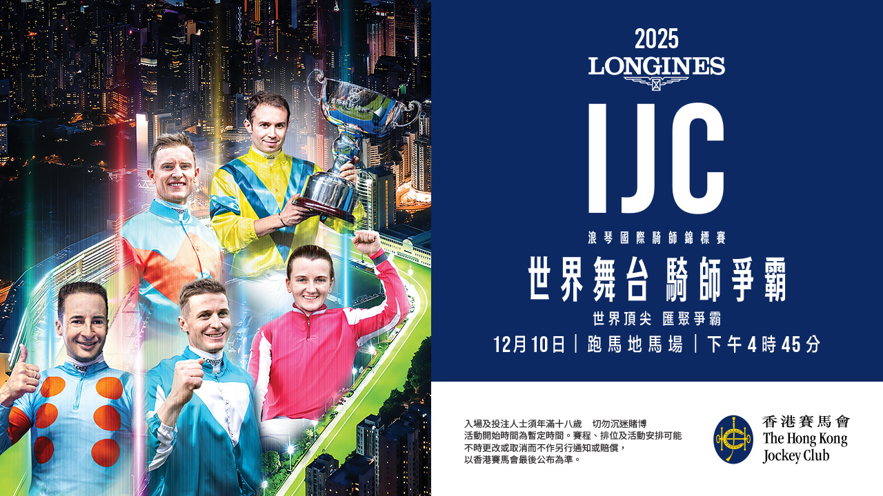 國際賽事週焦點之一「浪琴國際騎師錦標賽」於12月10日(星期三)晚上在跑馬地馬場舉行。作為全球獎金最豐厚的騎師挑戰賽之一,今年的「浪琴國際騎師錦標賽」將匯聚來自全球各地十二位頂級好手,開展一場技術與速度的巔峰對決。入場人士可以一睹一眾星級騎師在四場激烈比賽的英姿。當日活動將於下午4時45分開始,開幕典禮將於第三場賽事後舉行,國際流行音樂組合Now United當晚將作現場表演。而DJ Willy Monfret將於下午5時率先表演揭開序幕,一同迎接世界級賽馬活動。