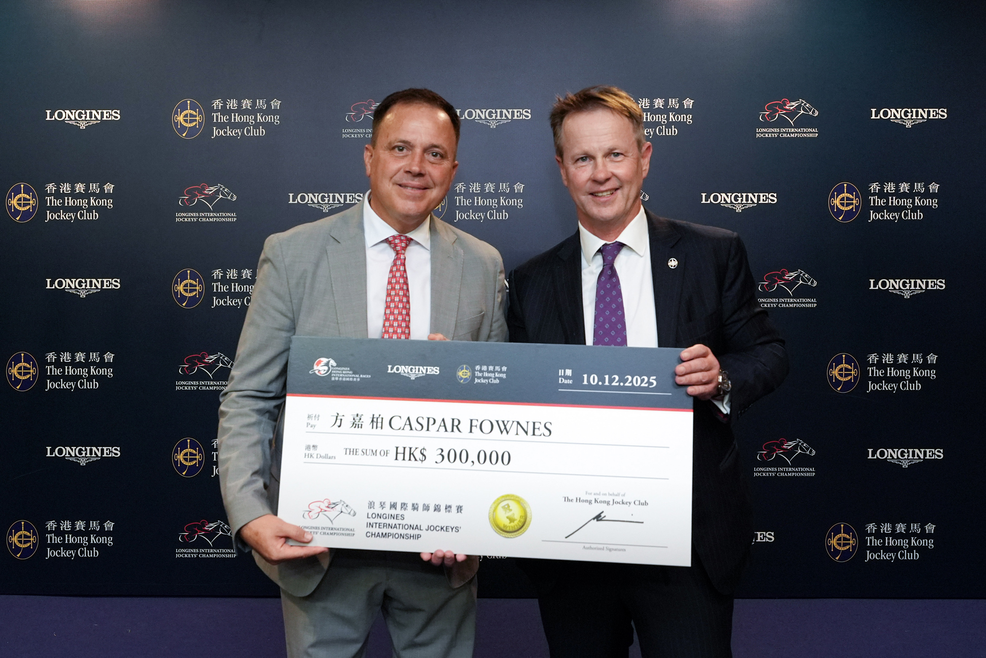 馬會賽馬事務執行總監夏定安(右)致送三十萬元獎金予浪琴國際騎師錦標賽成績最佳的練馬師方嘉柏。