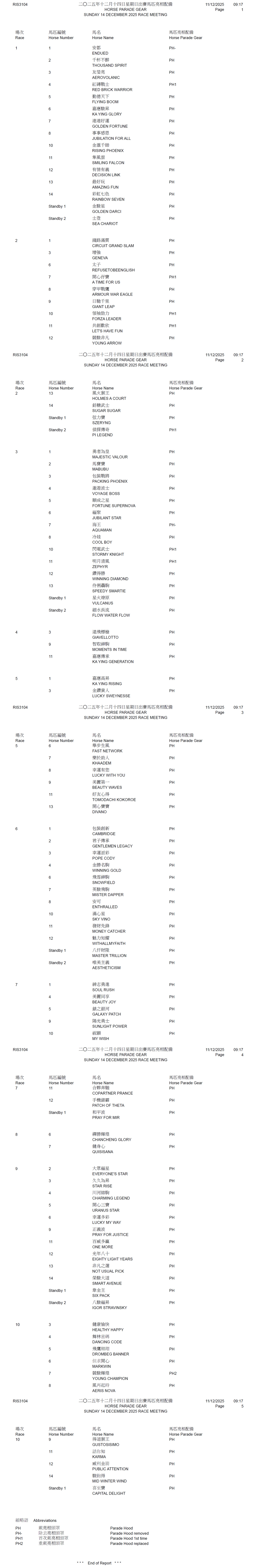 2025年12月14日星期日賽事 – 出賽馬匹亮相配備