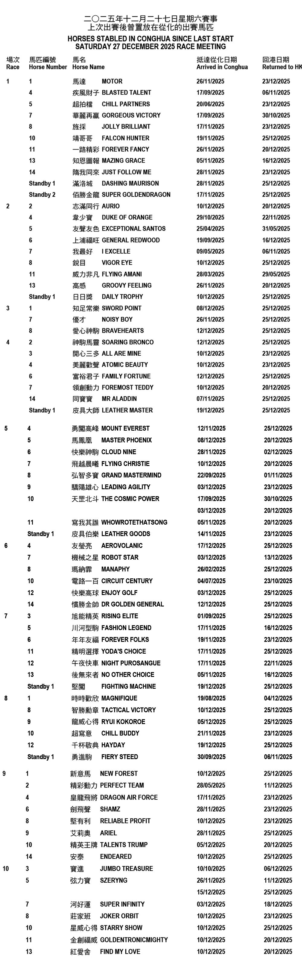 2025年12月27日星期六賽事–上次出賽後曾置放在從化的出賽馬匹