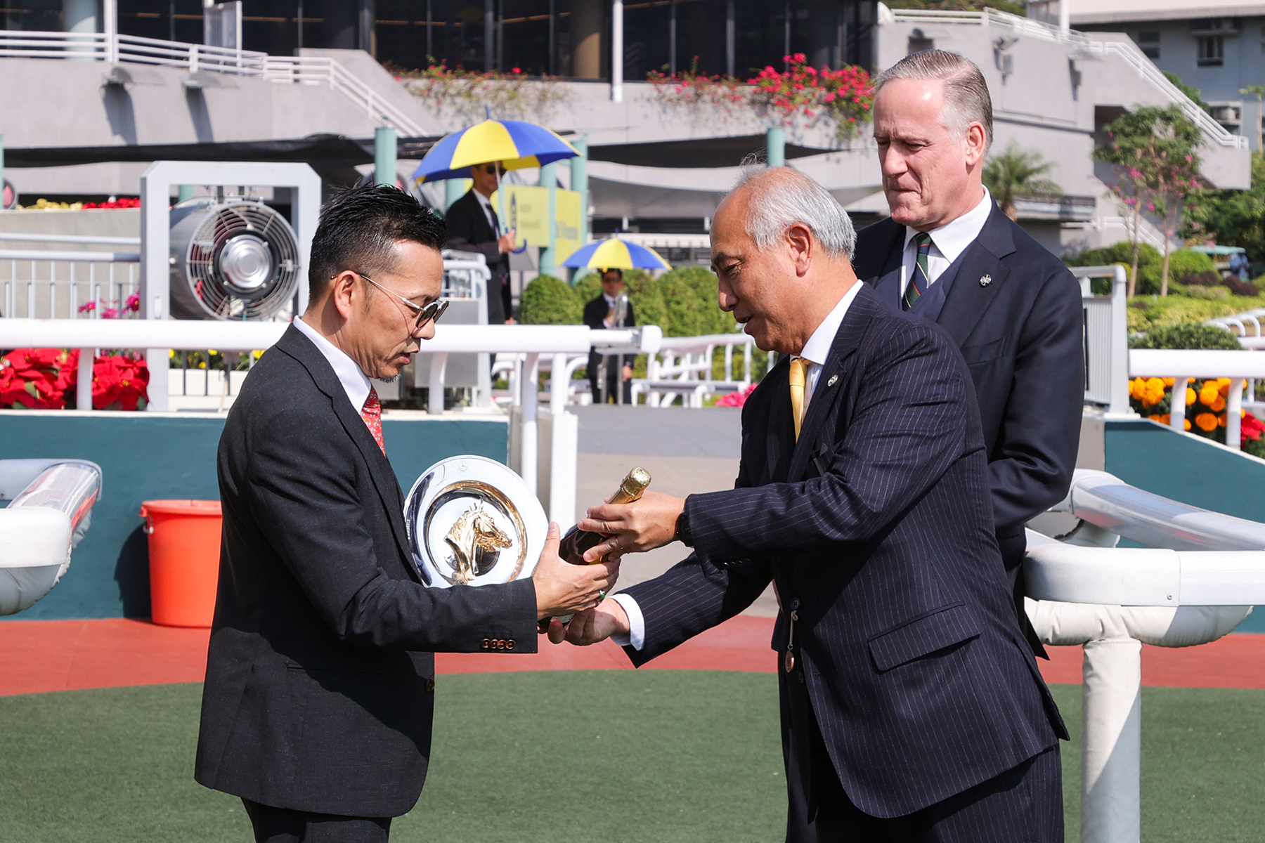 馬會署理行政總裁唐德誠及馬會署理賽馬事務執行總監鄭奇龍致送銀碟及香檳予練馬師羅富全。