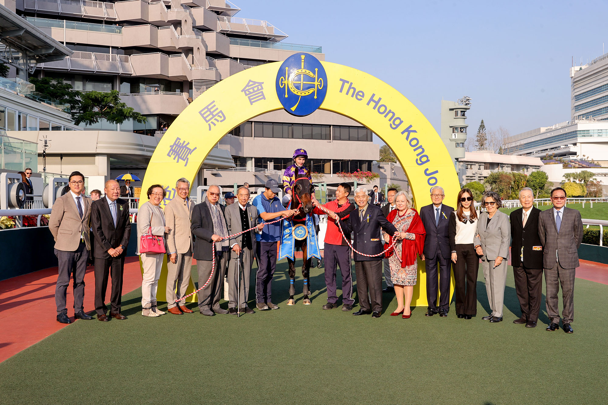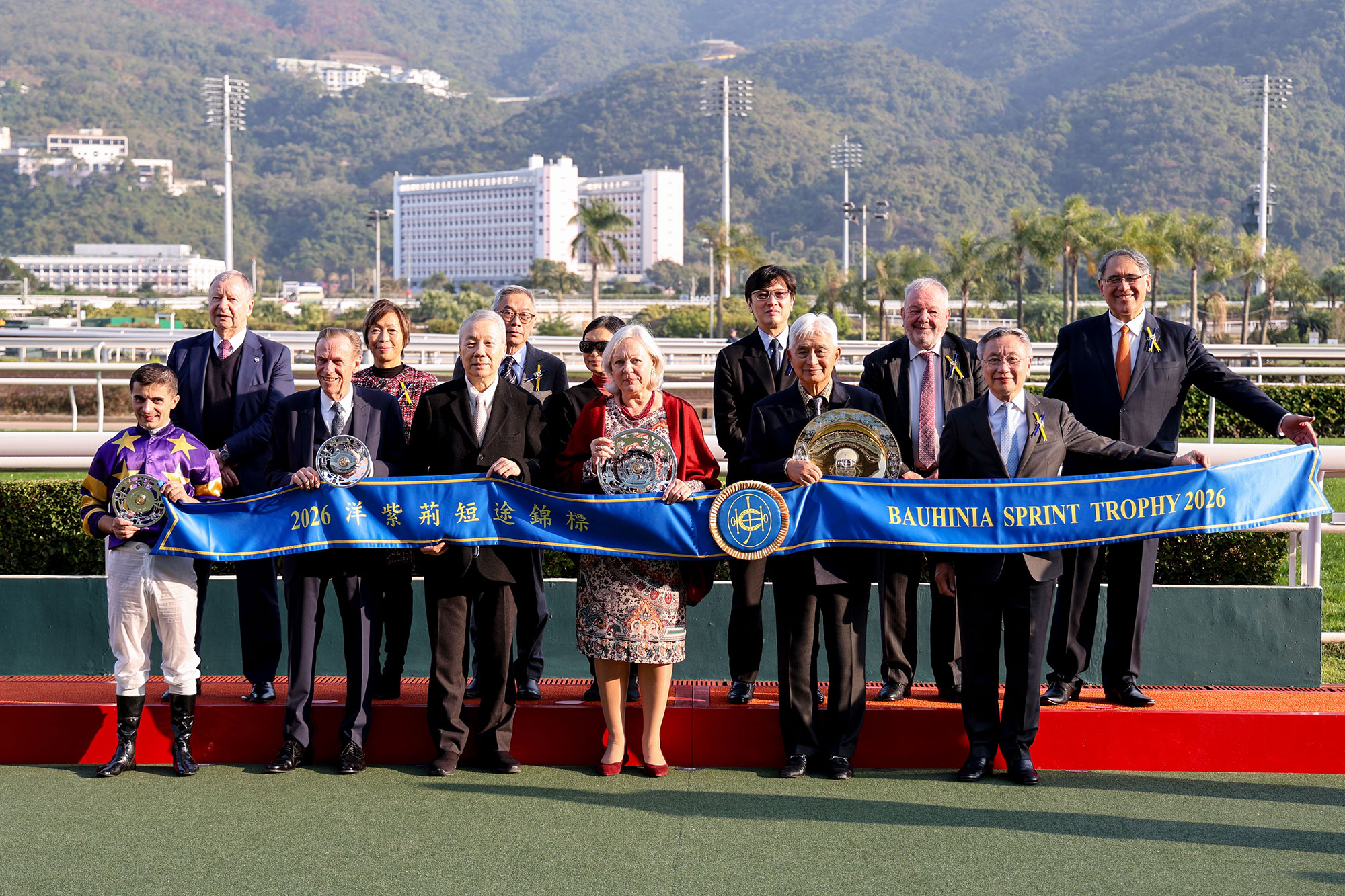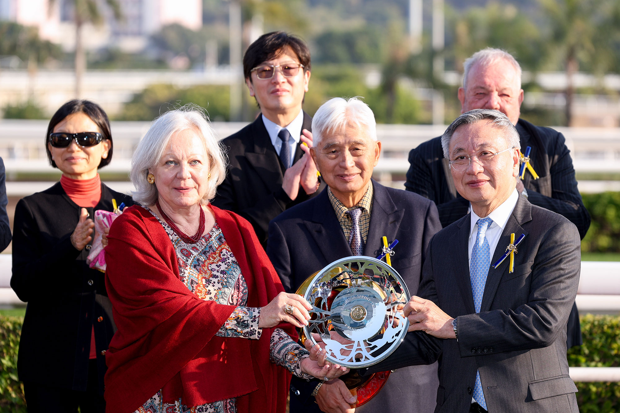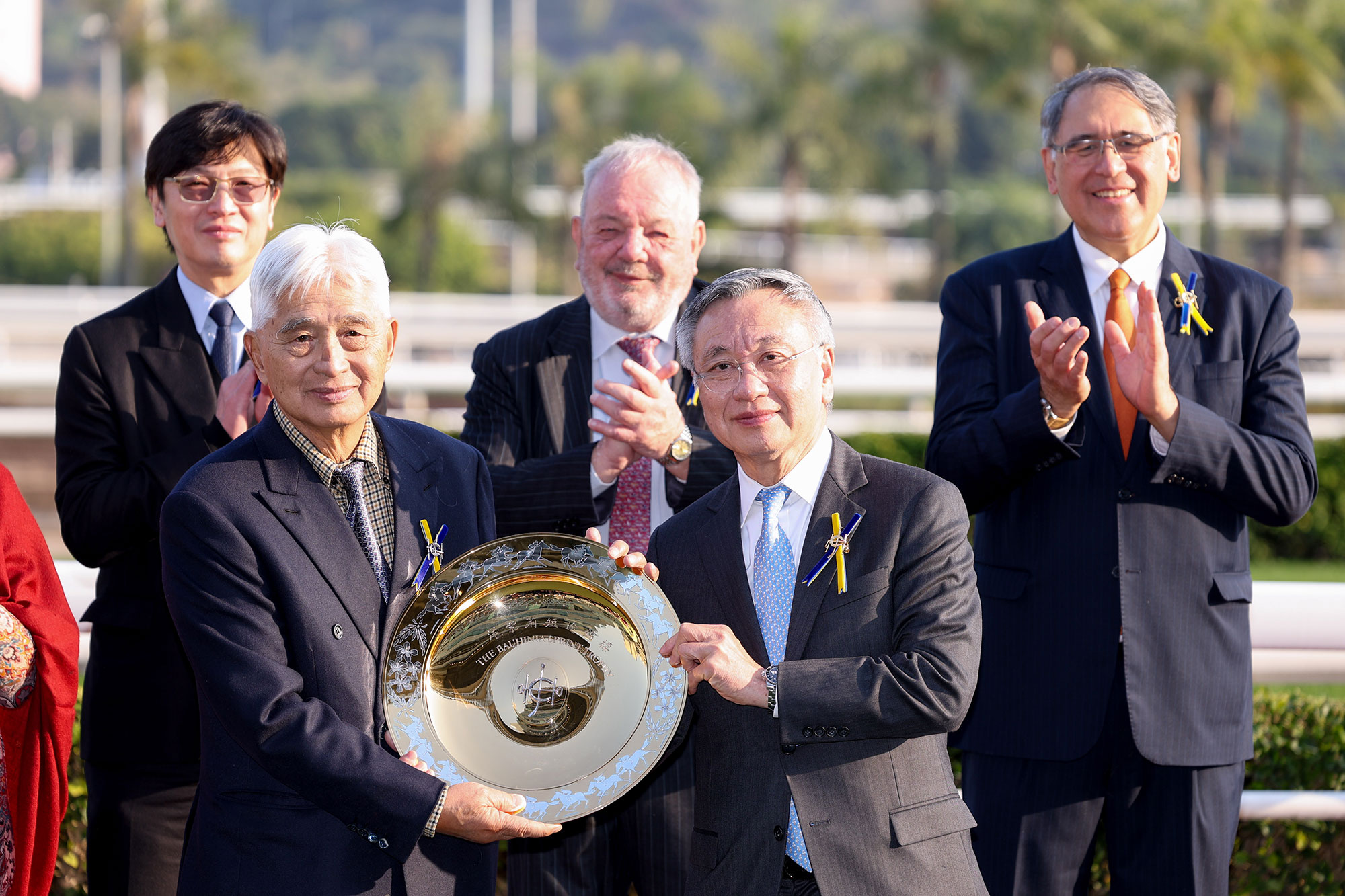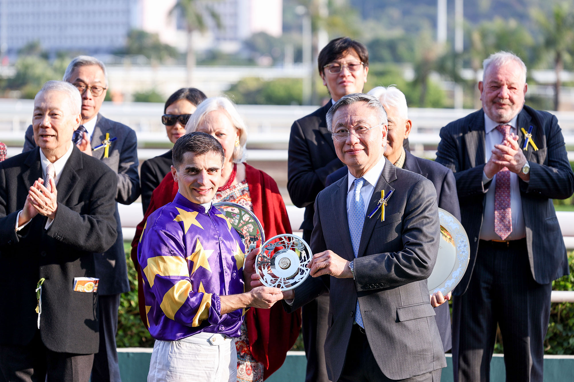 香港賽馬會董事羅啟華頒發獎盃及銀碟予頭馬「星際快車」的馬主榮智健及其代表、以及銀碟予勝出練馬師蔡約翰及勝出騎師艾兆禮。