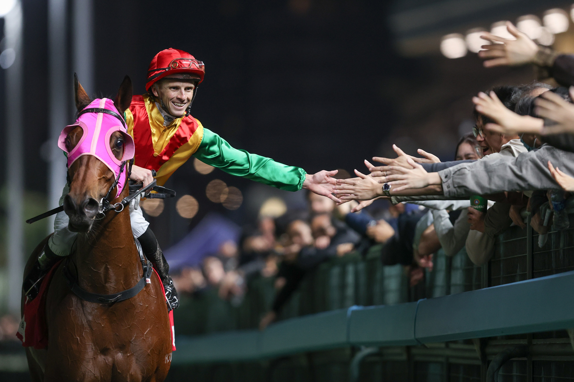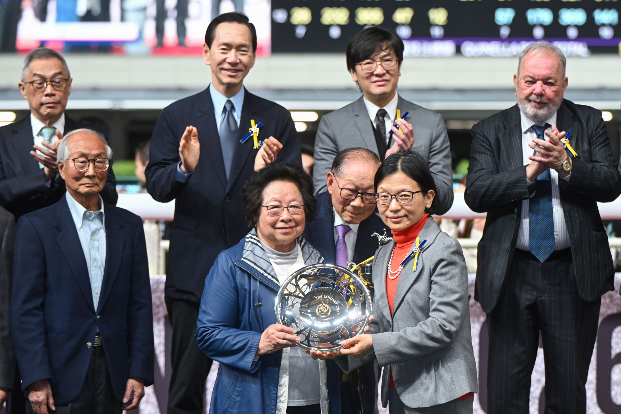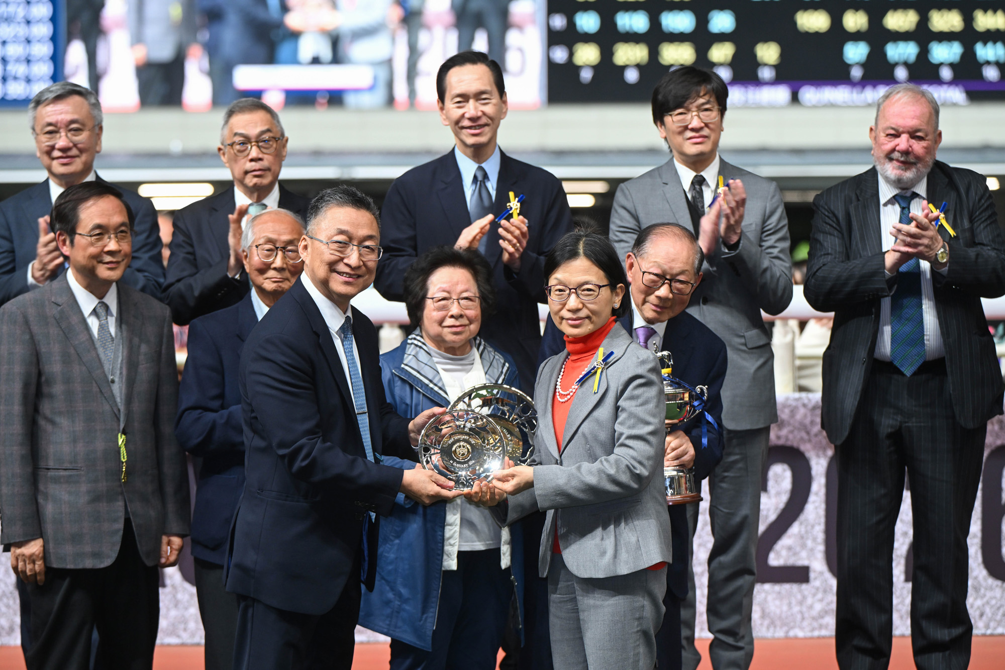 馬會董事馮婉眉頒發銀碟予「勁速威龍」的練馬師呂健威及騎師希威森。