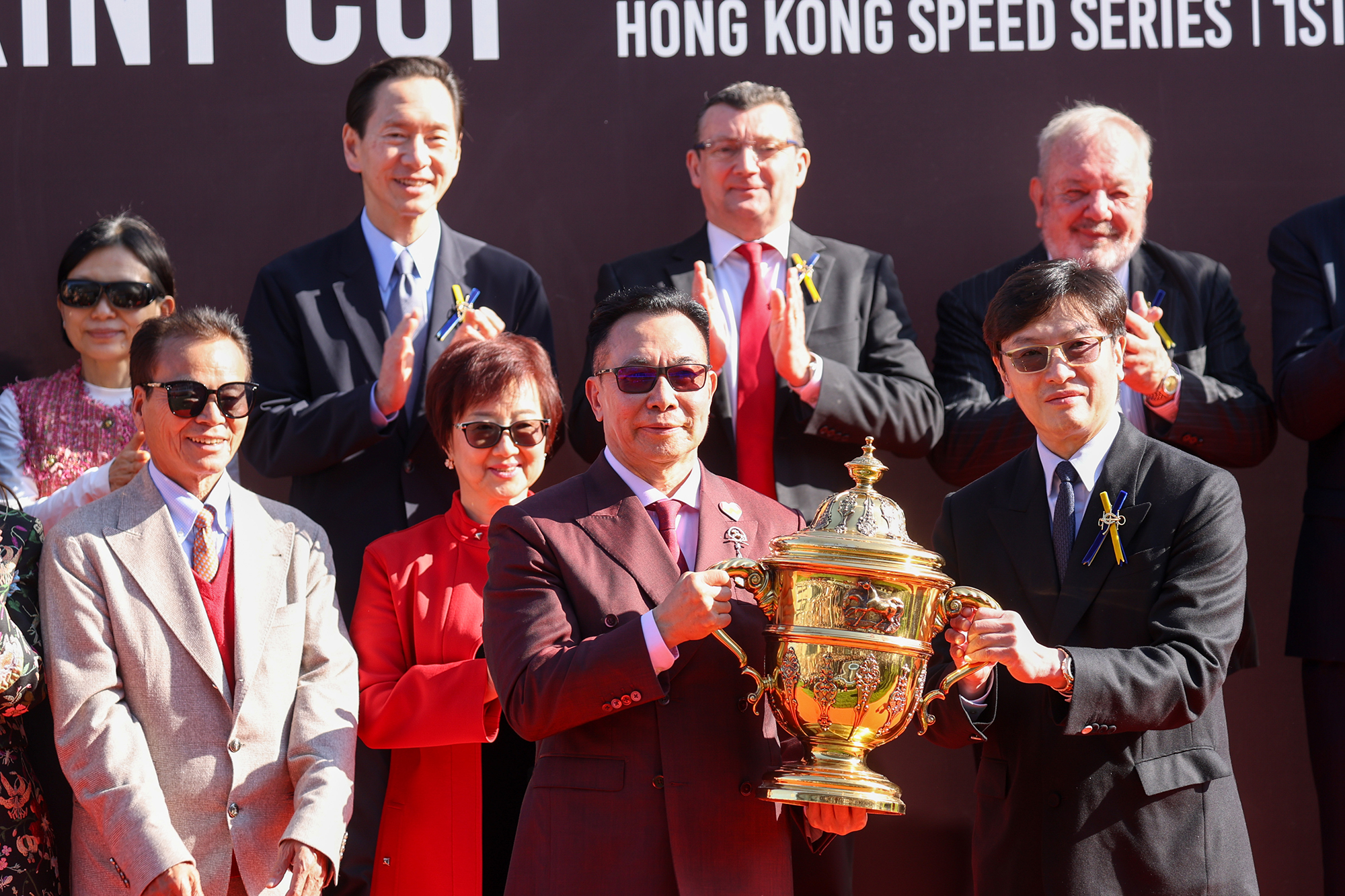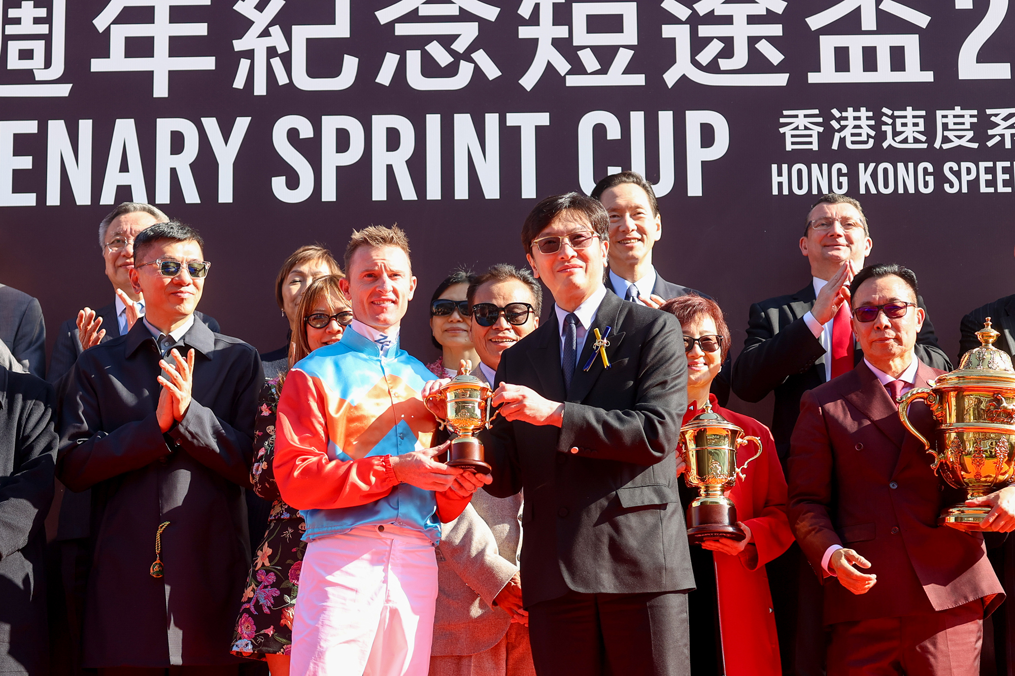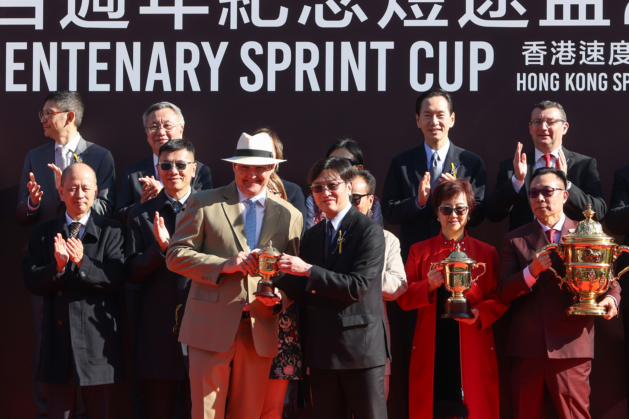 馬會董事陳衍里醫生在頒獎儀式上將百週年紀念短途盃及小型獎盃頒予「嘉應高昇」的馬主嘉應團體的代表、練馬師大衛希斯及騎師潘頓。