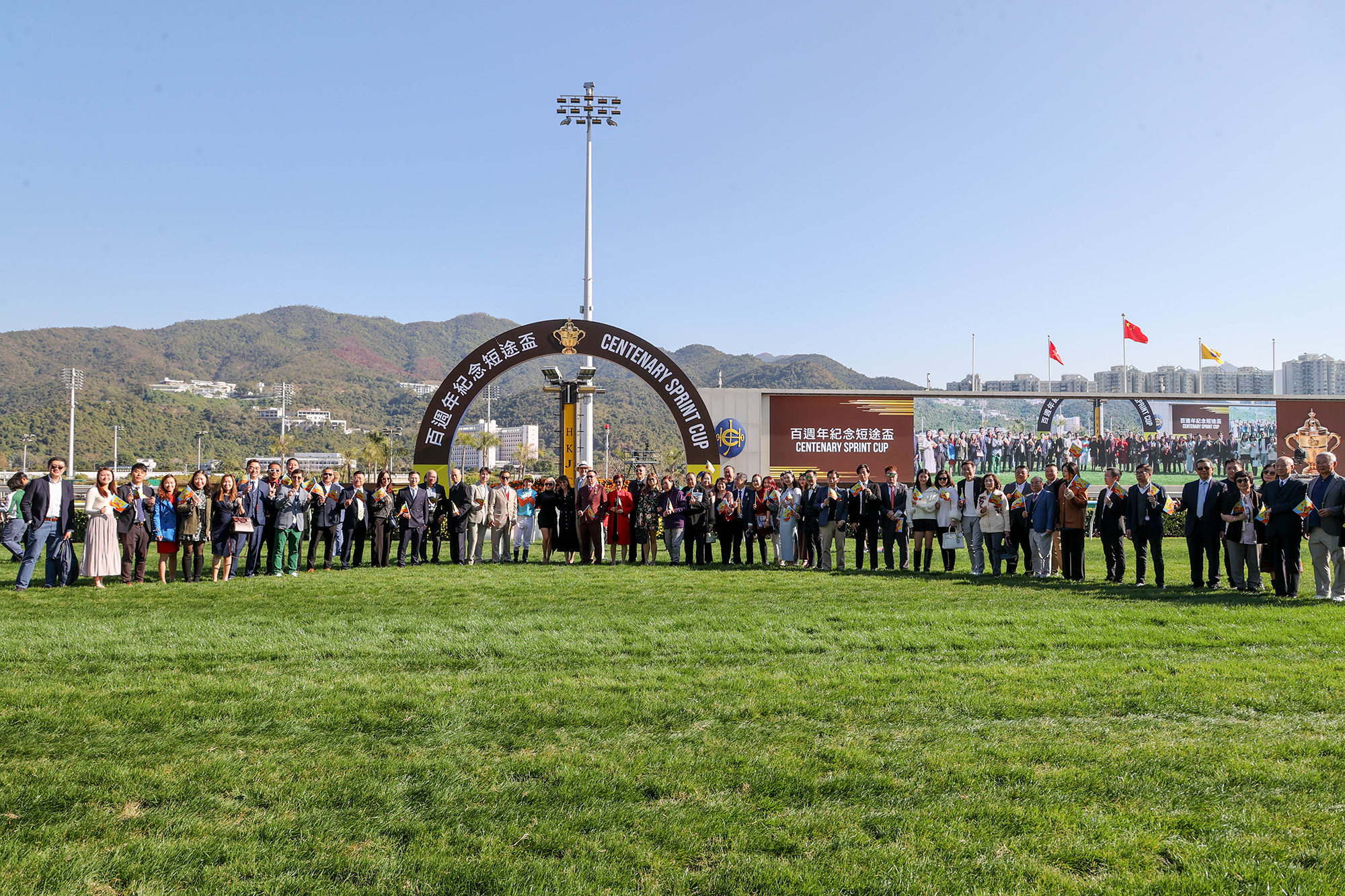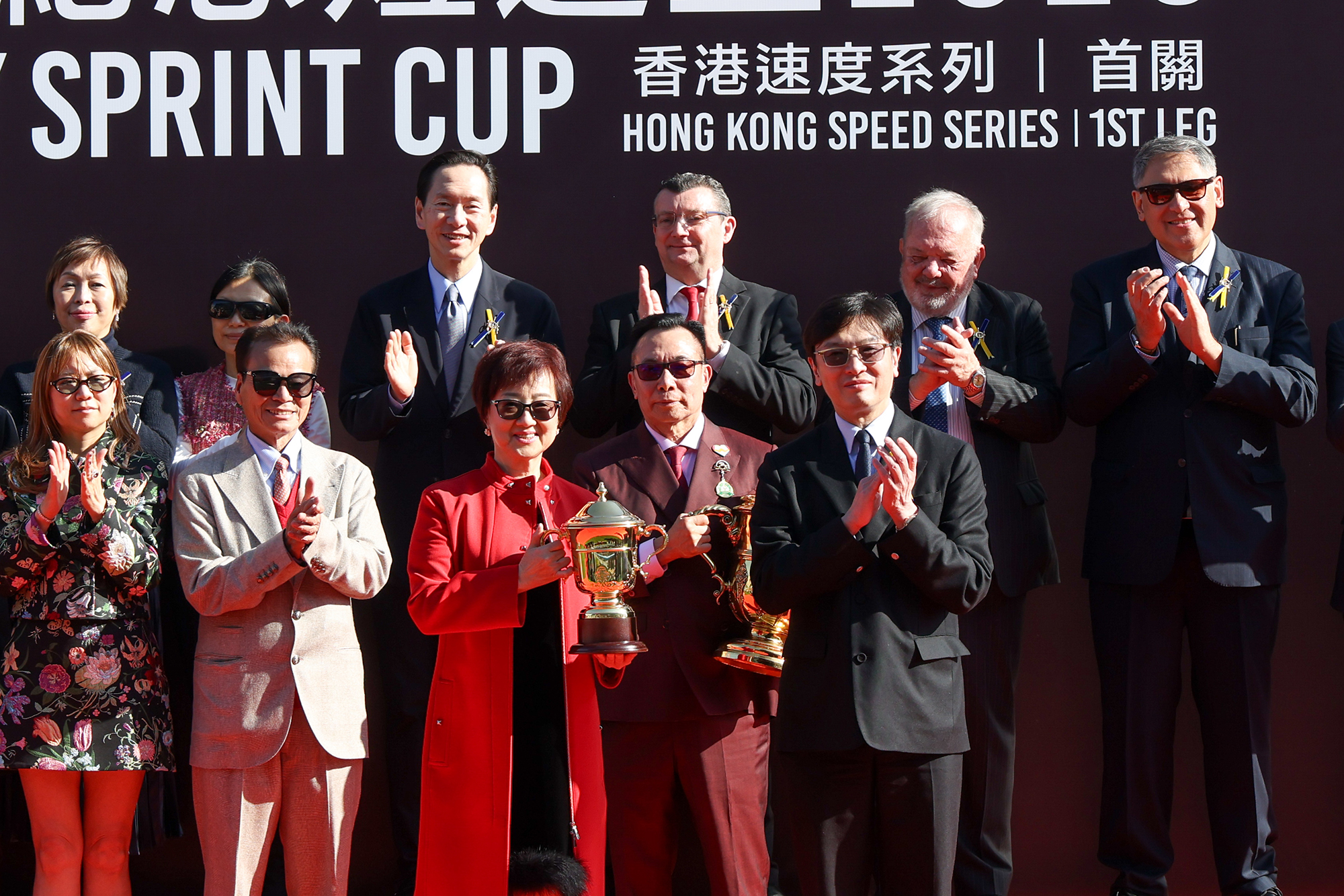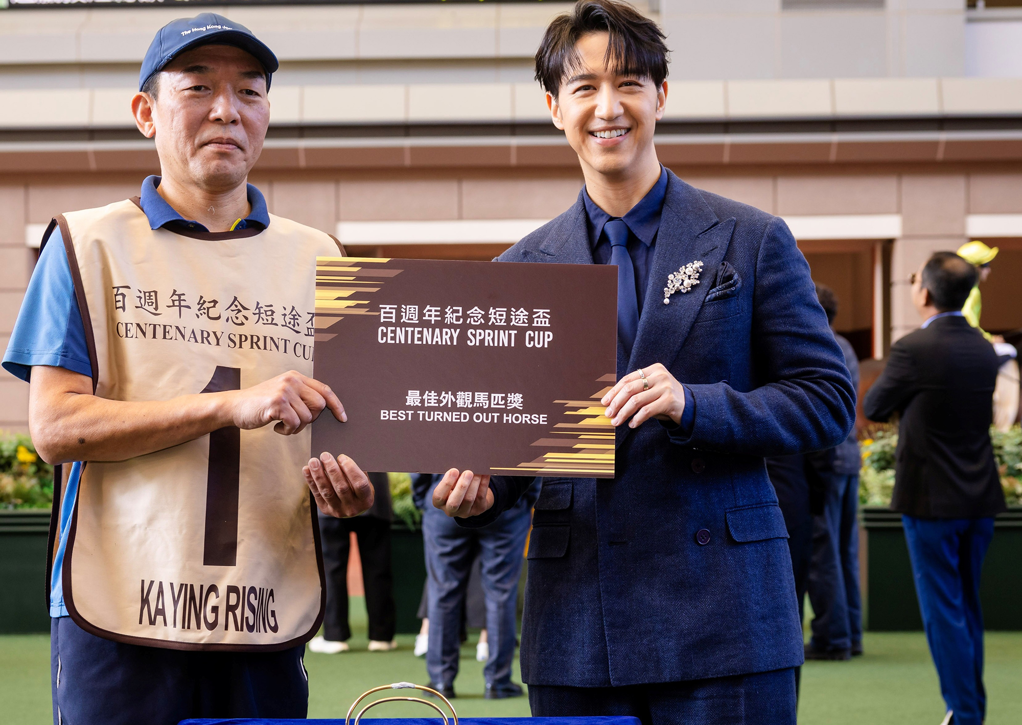 馬會董事陳衍里醫生在頒獎儀式上將百週年紀念短途盃及小型獎盃頒予「嘉應高昇」的馬主嘉應團體的代表、練馬師大衛希斯及騎師潘頓。