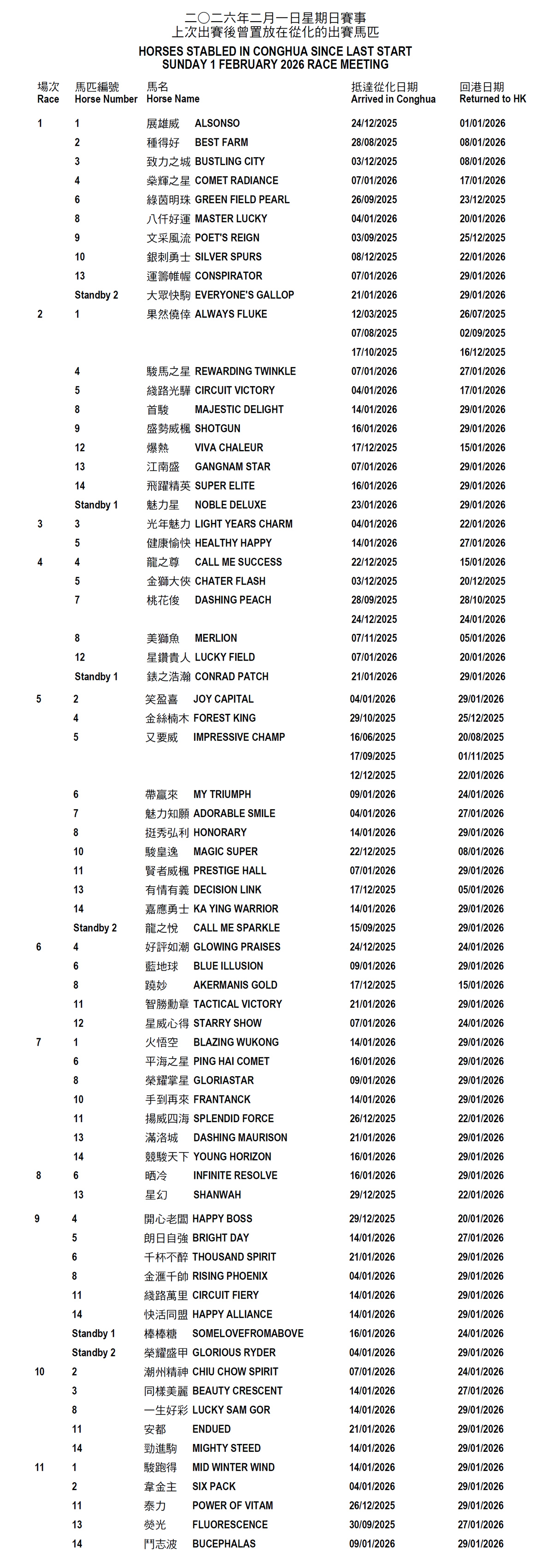 2026年2月1日星期日賽事 – 上次出賽後曾置放在從化的出賽馬匹