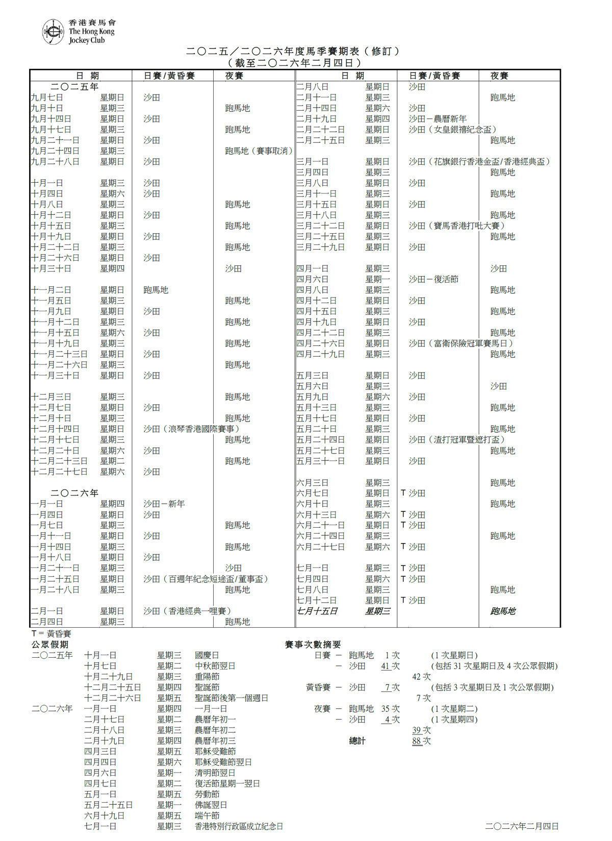 2025/2026年度馬季賽期表 (更新)