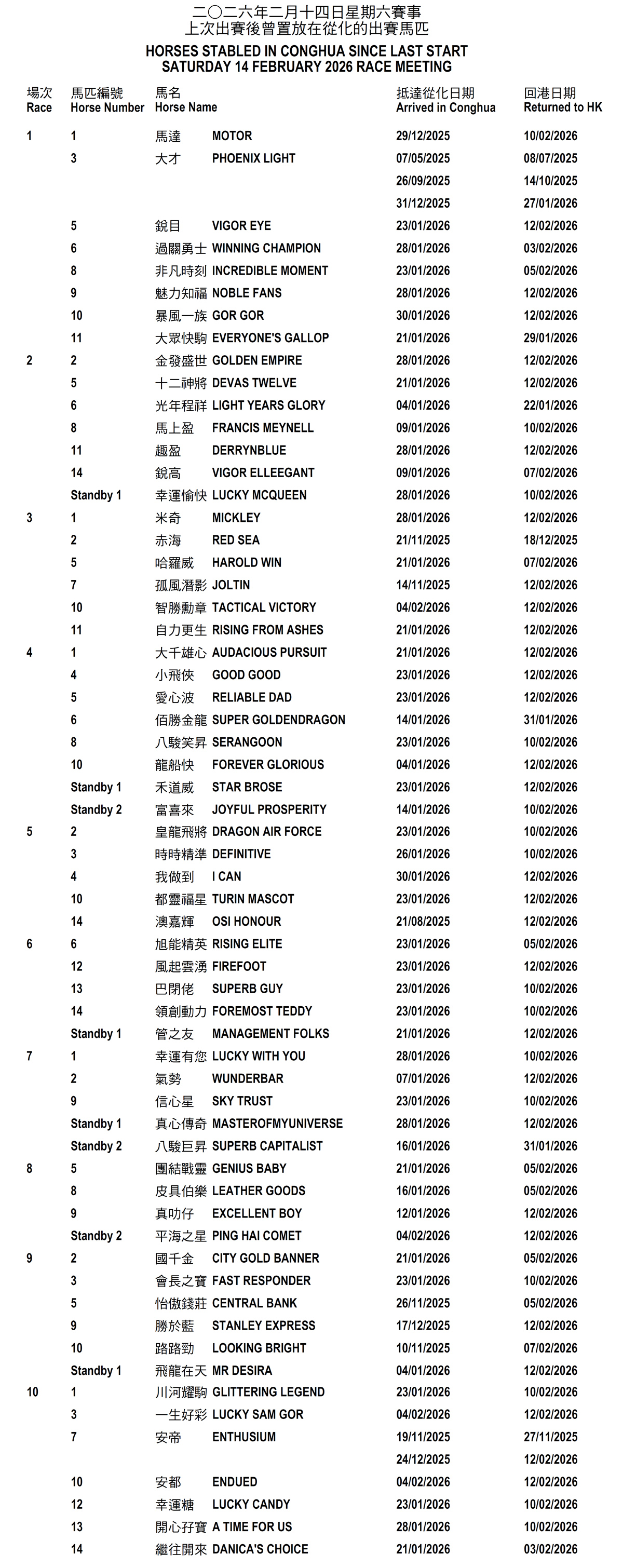 2026年2月14日星期六賽事 - 上次出賽後曾置放在從化的出賽馬匹