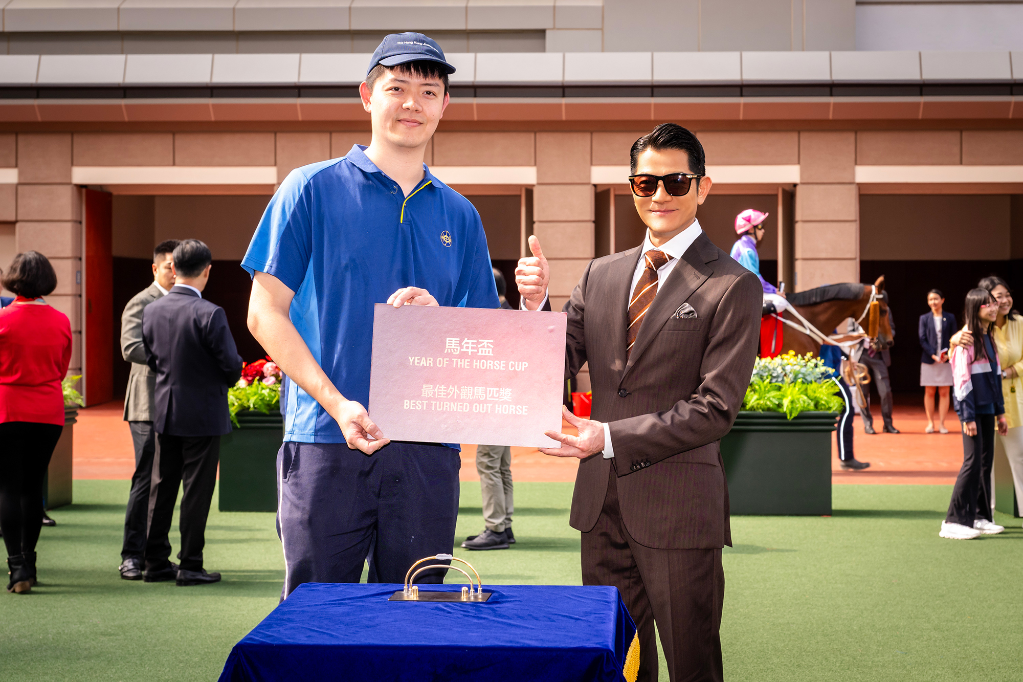 「太陽勇士」獲選馬年盃最佳外觀馬匹,「馬年大使」郭富城頒發獎項予料理該駒的馬房助理。