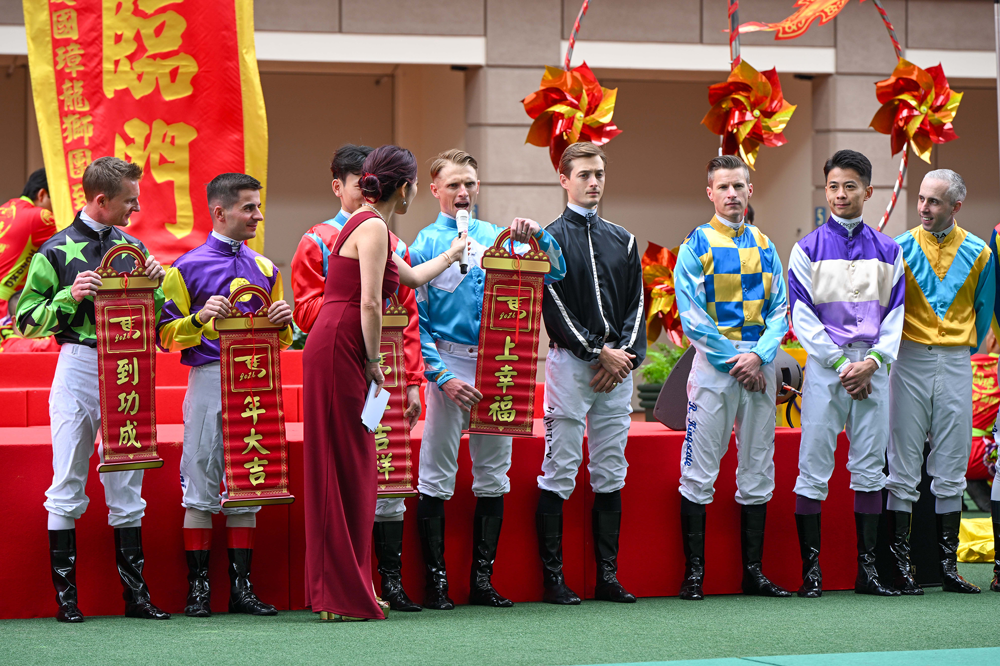 一眾騎師在馬匹亮相圈向市民拜年,祝願大家暢旺年年。