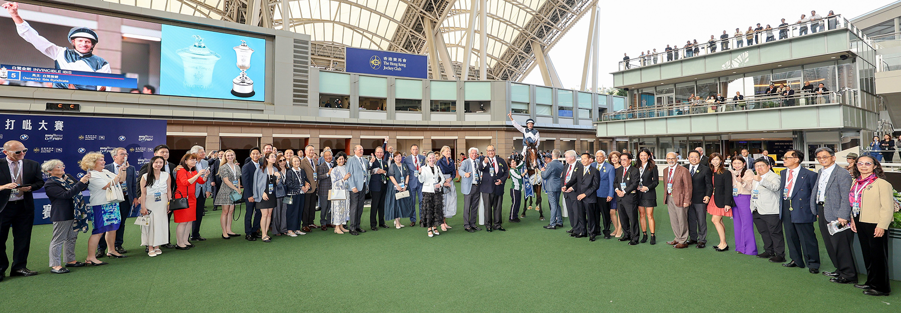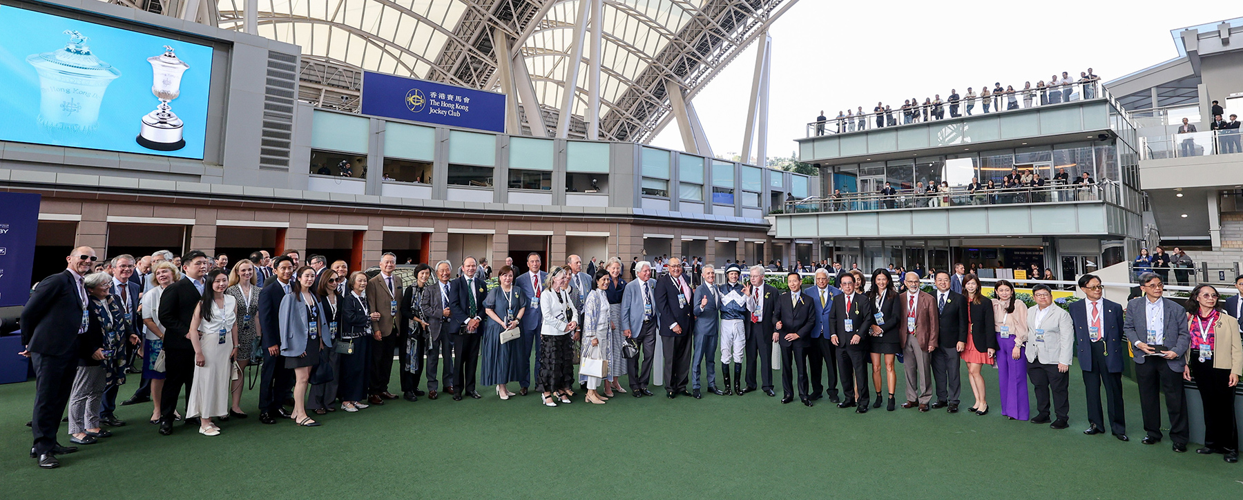 「白鷺金剛 」的馬主團體及親友,賽後與該駒的騎練一同祝捷。