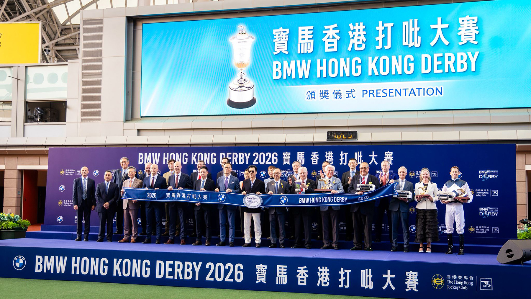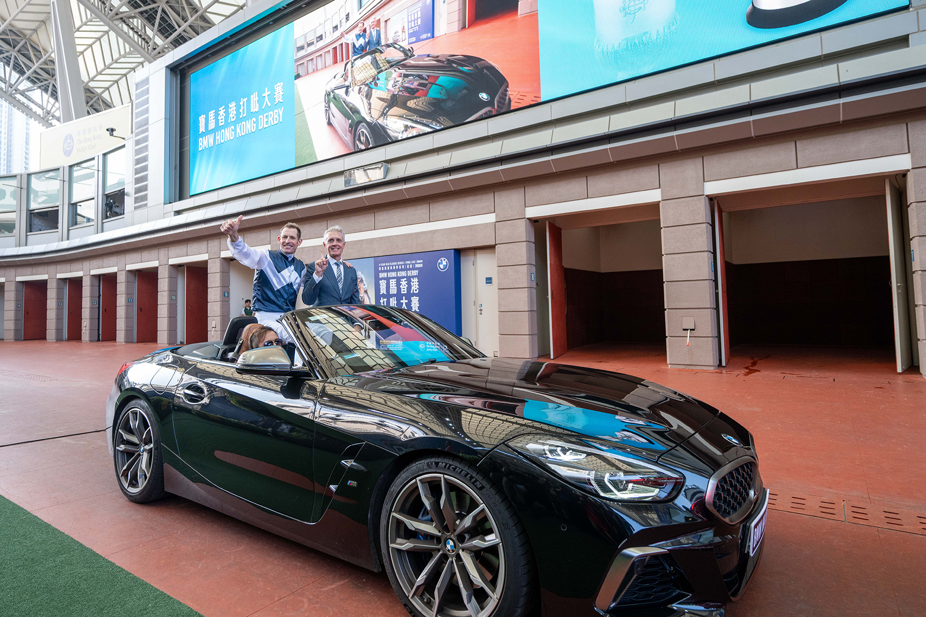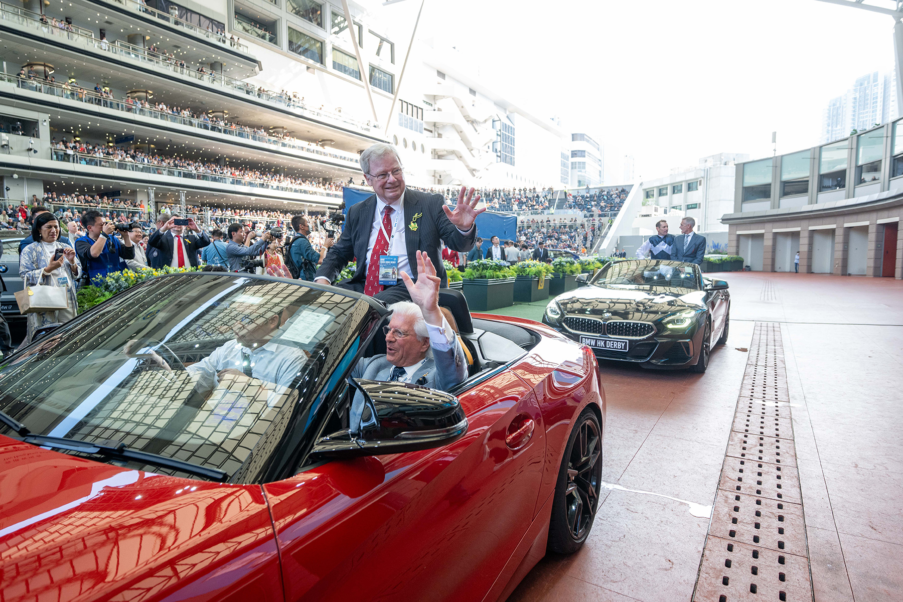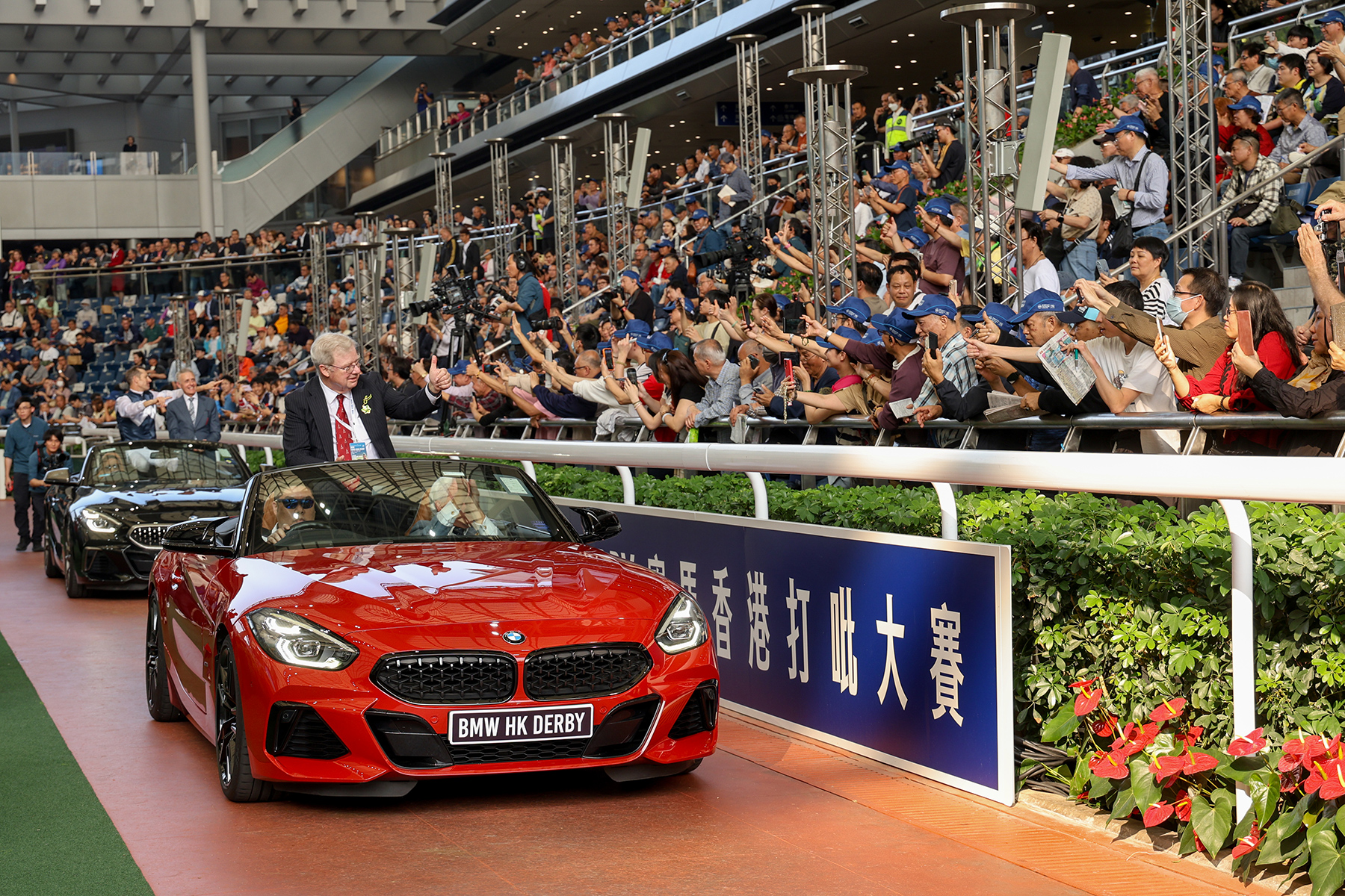 寶馬香港打吡大賽冠軍「白鷺金剛 」的馬主白鷺團體代表、練馬師及騎師,於頒獎儀式後乘坐寶馬開篷跑車,在馬匹亮相圈內巡遊,接受馬迷祝賀及答謝大家的支持。