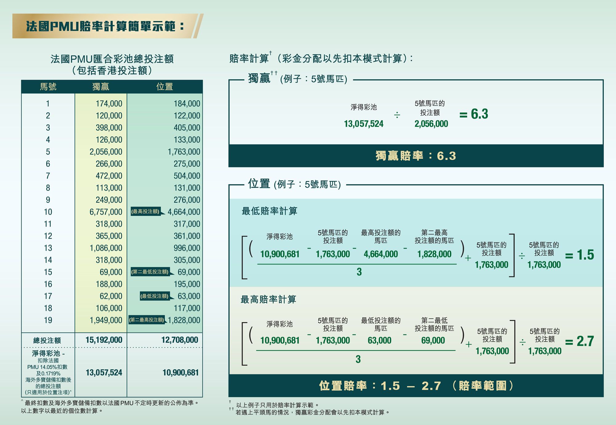 一如以往的法國匯出彩池△安排,賽事的獨贏及位置彩池的注項將匯出至PMU彩池,其經修訂的PMU賽馬博彩規例將適用於相關的匯出彩池。連贏、位置Q及其他特別彩池仍以香港獨立彩池開辦。