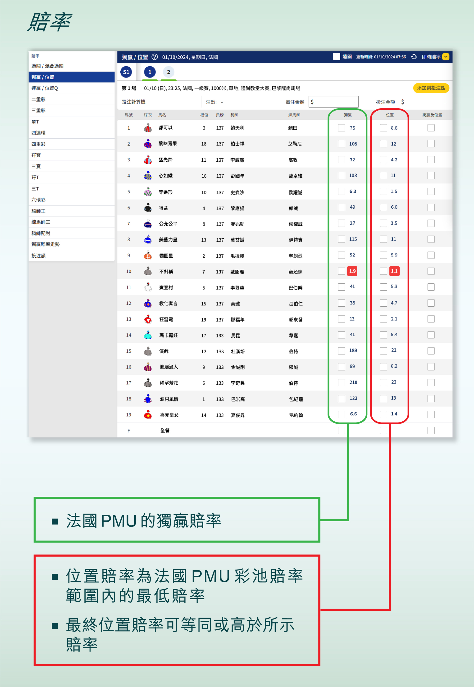 匯出彩池的投注方法不變,亦即與投注香港彩池方法相同。而賠率計算方式則會按照法國PMU使用的模式,即是先以扣本的模式作出計算(圖一)。賠率資料方面,當上一場場次的派彩作實後,即場場次的香港注項將匯出至法國PMU彩池,屆時彩池所顯示的賠率即轉為法國PMU 當地的賠率,當中位置所顯示的賠率為最低賠率(圖二);換言之,最終的位置賠率可等同或高於所顯示的數值。如欲知悉更多匯出彩池的資料,顧客可瀏覽馬會網站(https://campaigns.hkjc.com/outbound-commingling/ch/)。