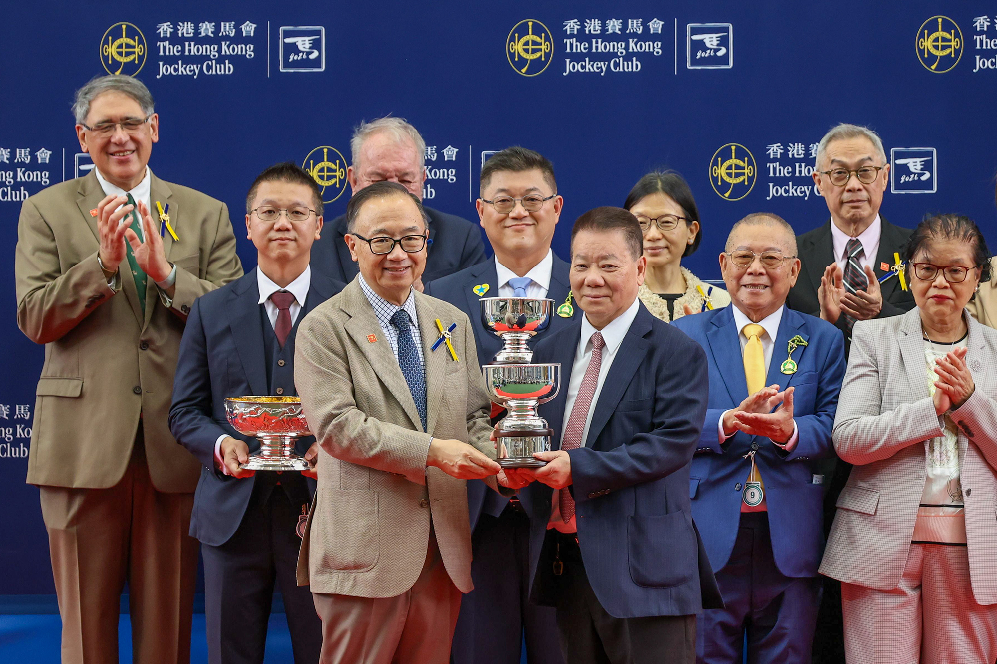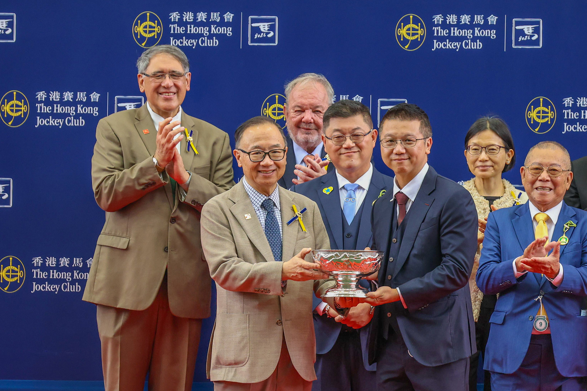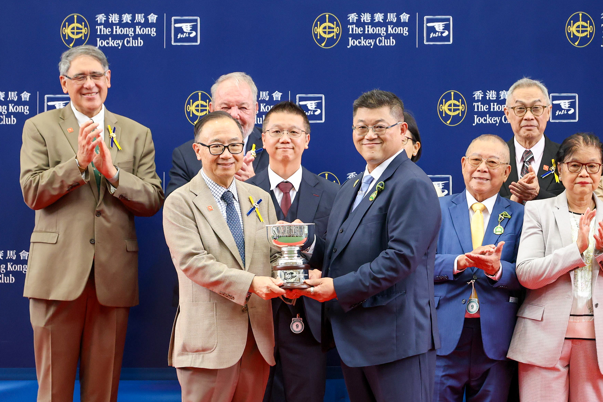 馬會主席廖長江在頒獎禮上將主席錦標獎盃及小型獎盃頒予「金鑽貴人 」的馬主鄭裕偉及鄭裕彤、練馬師文家良及騎師梁家俊。