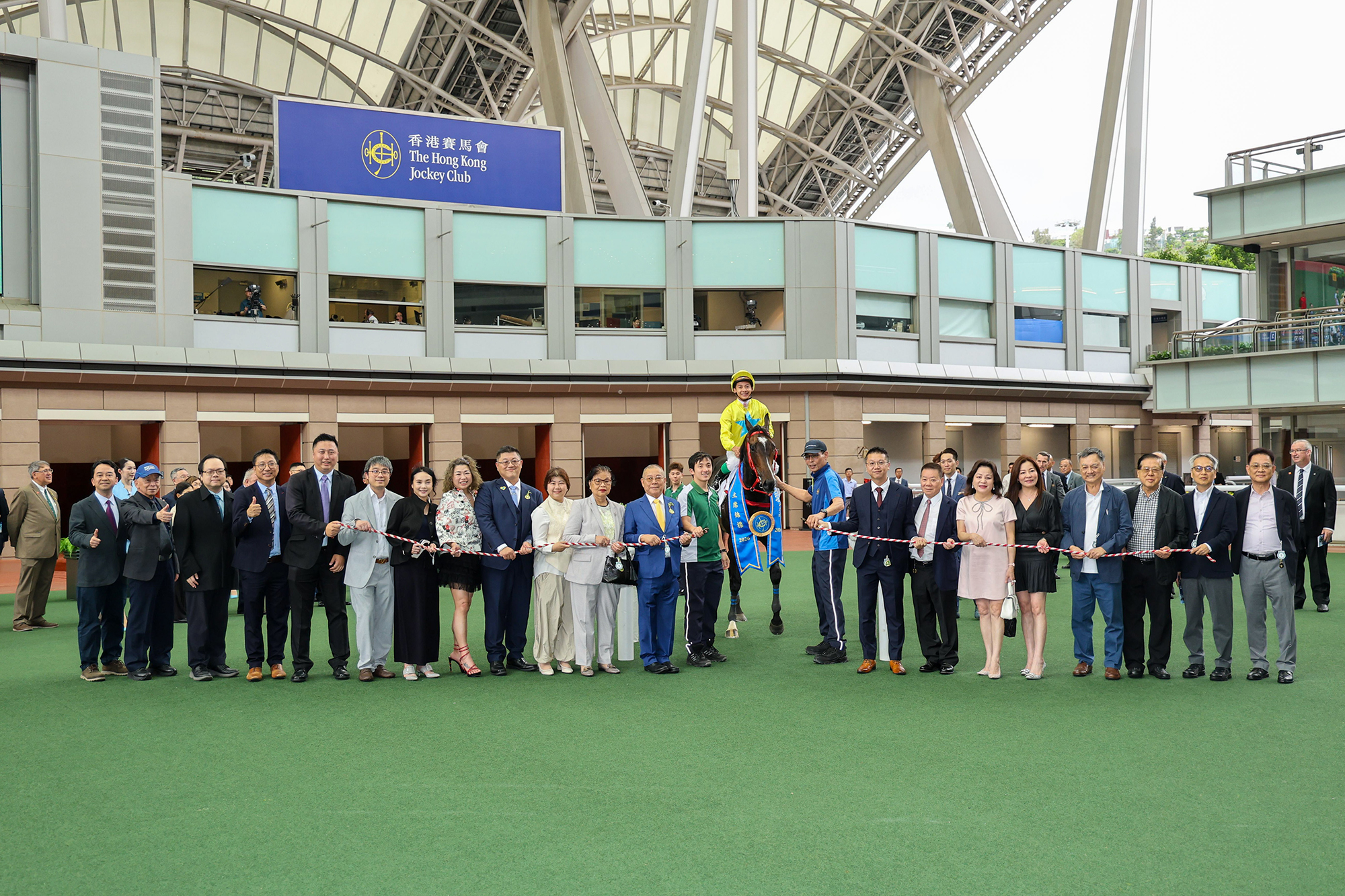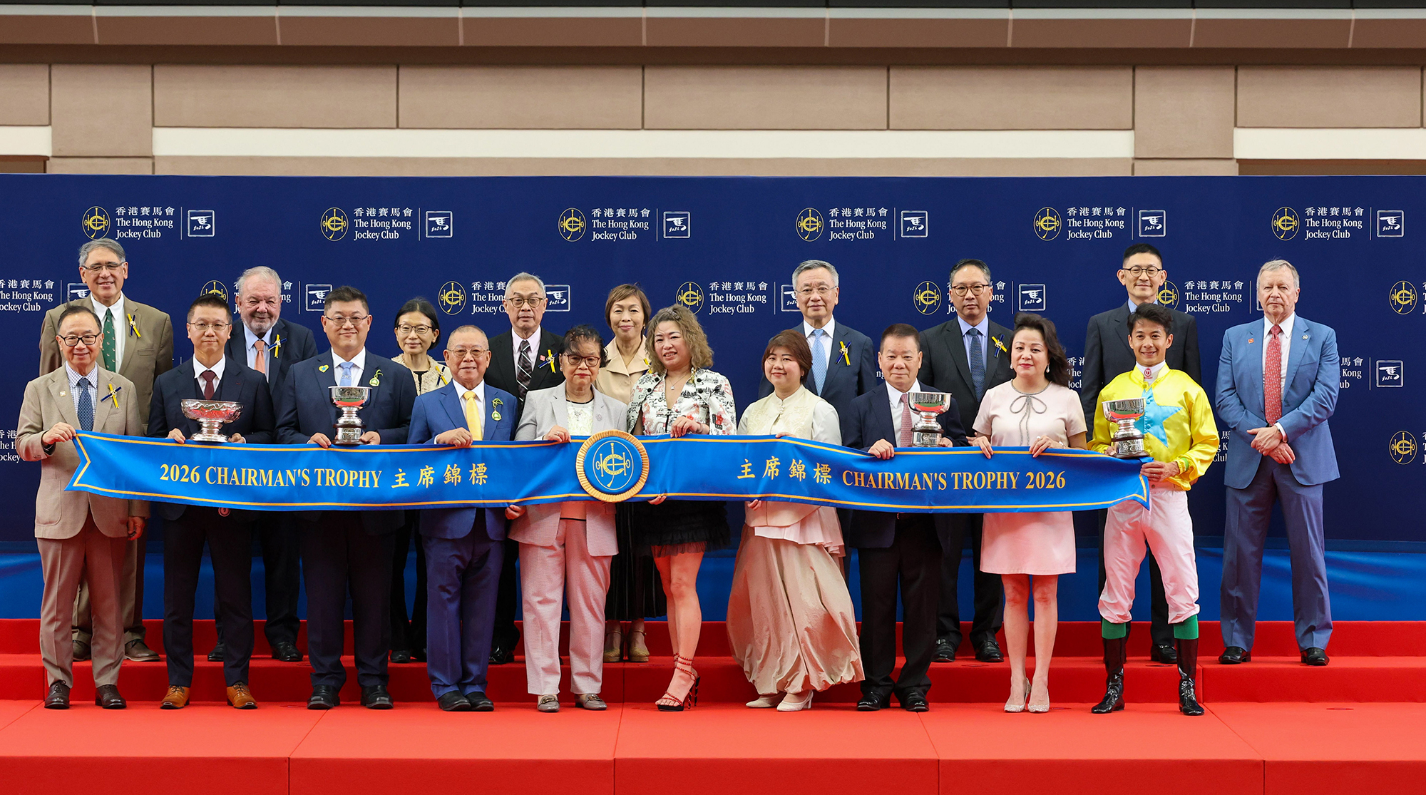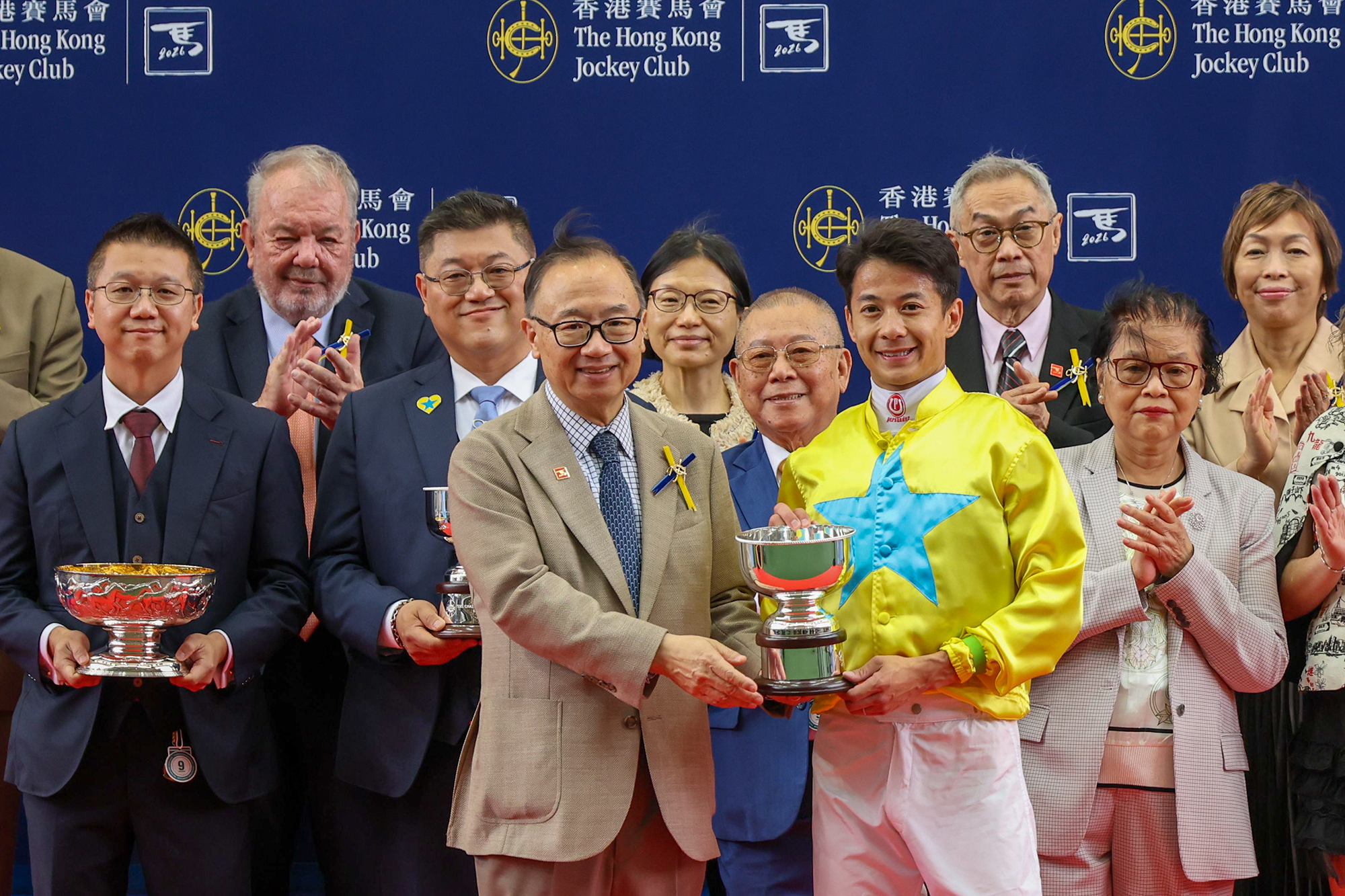 馬會主席廖長江在頒獎禮上將主席錦標獎盃及小型獎盃頒予「金鑽貴人 」的馬主鄭裕偉及鄭裕彤、練馬師文家良及騎師梁家俊。