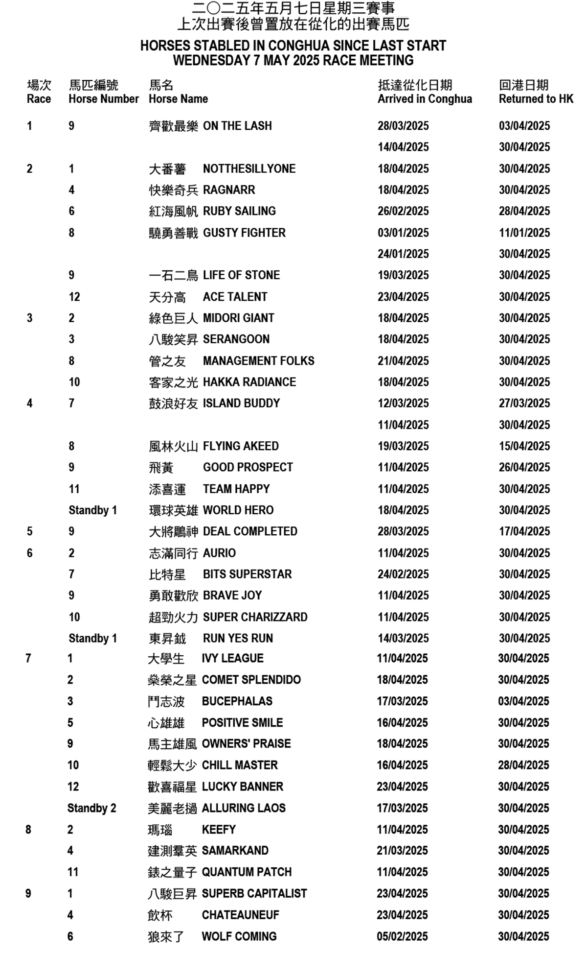 Horses stabled in Conghua since last start – Wednesday 7 May 2025 race meeting