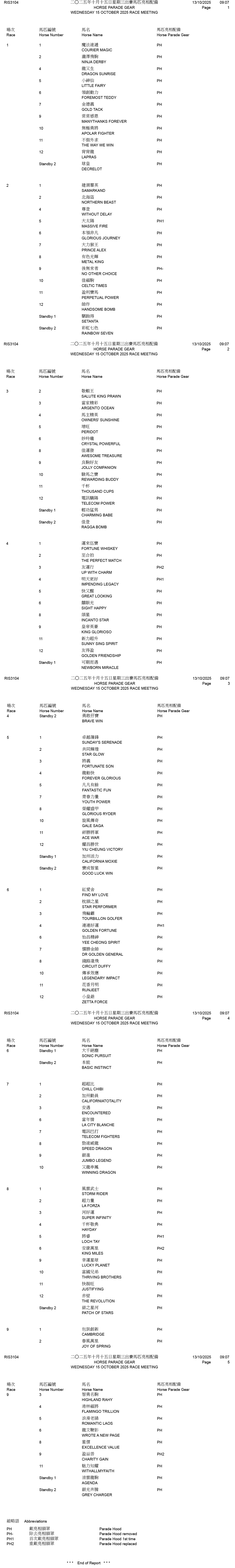 Horses stabled in Conghua since last start – Wednesday 15 October 2025 Race Meeting