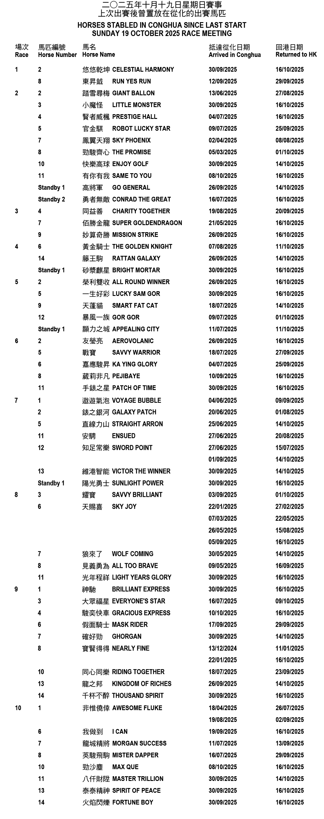 Horses stabled in Conghua since last start – Sunday 19 October 2025 Race Meeting