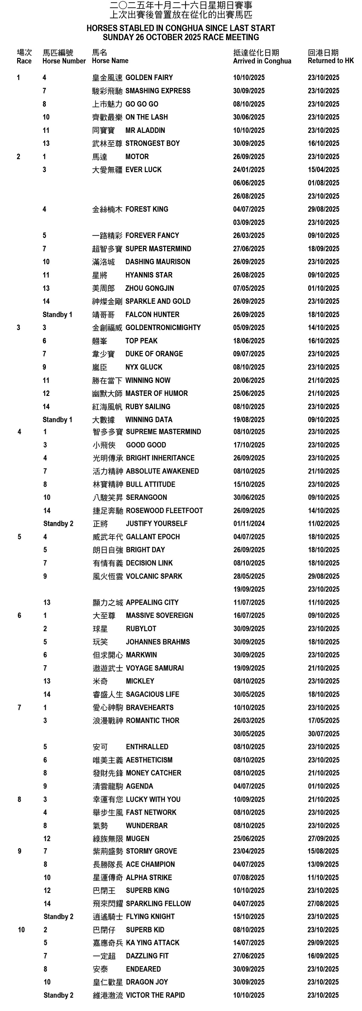 Horses stabled in Conghua since last start – Sunday 26 October 2025 Race Meeting