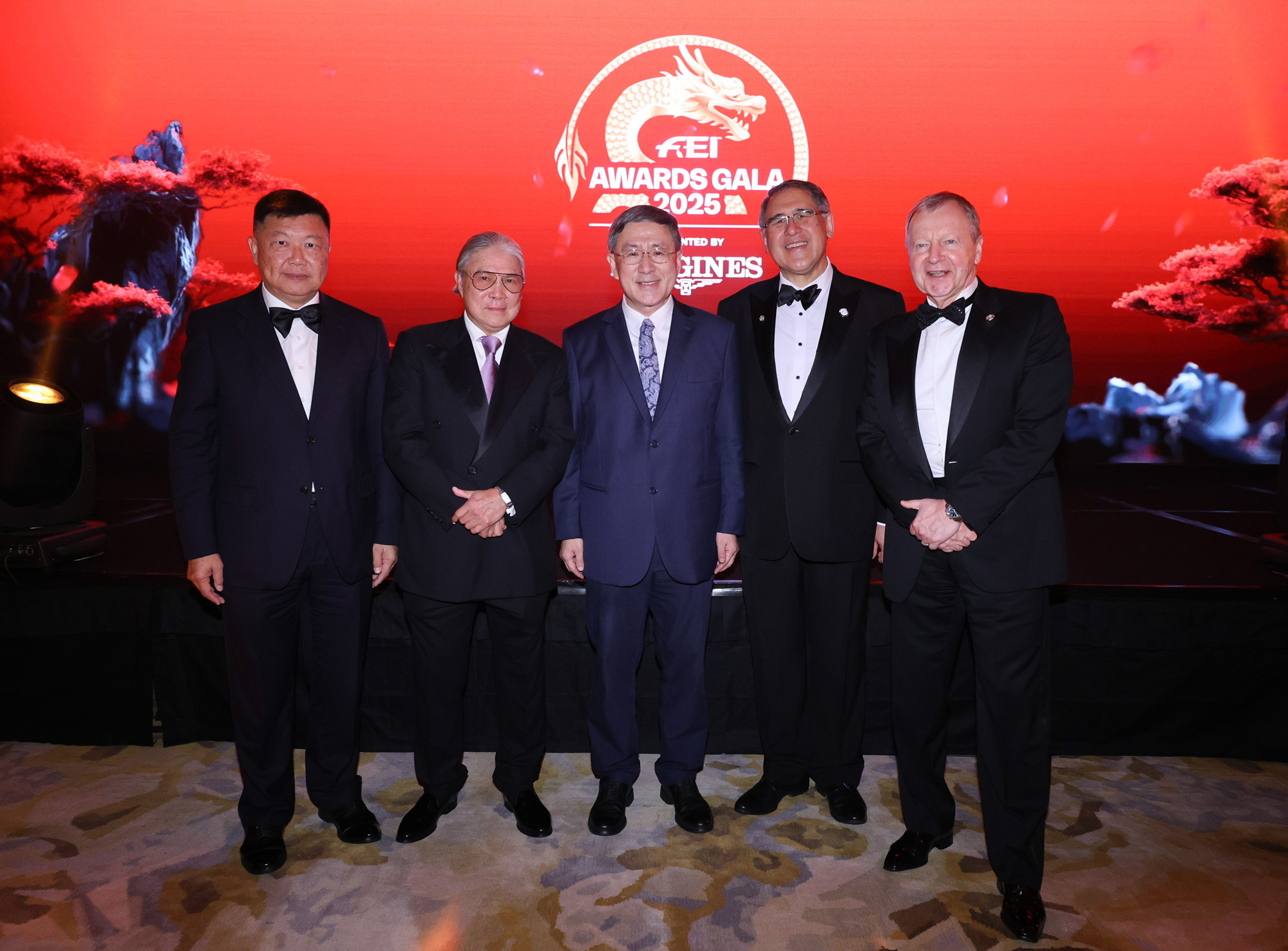 Cheuk Wing-hing, Deputy Chief Secretary for Administration of the HKSAR Government (centre); Lester Huang, Deputy Chairman of The Hong Kong Jockey Club and President of the Equestrian Federation of Hong Kong, China (2nd right); Winfried Engelbrecht-Bresges, CEO of The Hong Kong Jockey Club (1st right); Timothy Fok, President of the Sports Federation & Olympic Committee of Hong Kong, China (SF&OC) (2nd left); and Edgar Yang, Honorary Secretary General of SF&OC (1st left) attended the FEI Awards Gala last Friday.