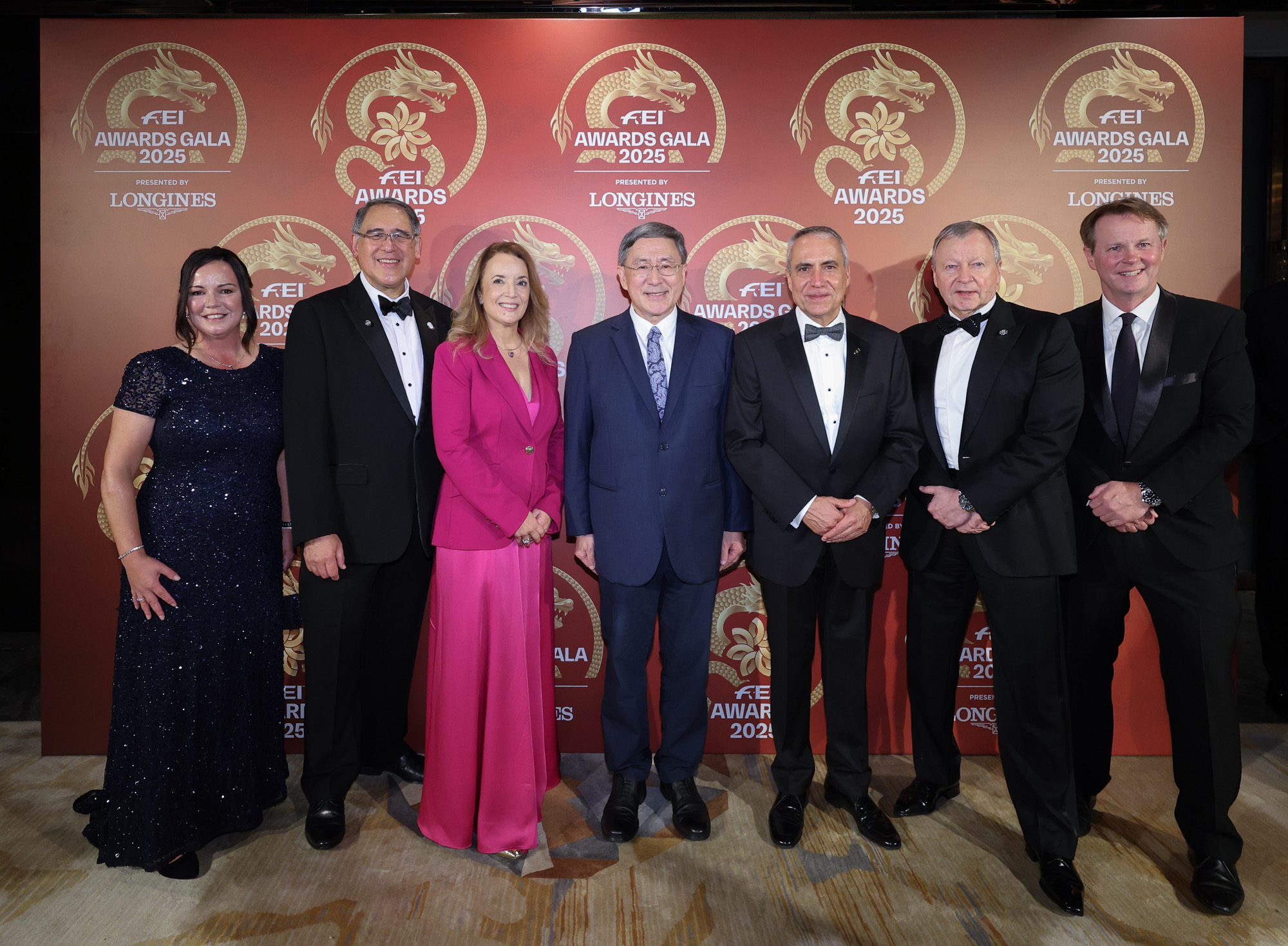 Cheuk Wing-hing, Deputy Chief Secretary for Administration of the HKSAR Government (centre); Lester Huang, Deputy Chairman of The Hong Kong Jockey Club and President of the Equestrian Federation of Hong Kong, China (2nd left); Winfried Engelbrecht-Bresges, CEO of The Hong Kong Jockey Club (2nd right); Ingmar De Vos, President of FEI (3rd right); Sabrina Ibáñez, Secretary General of FEI (3rd left); Andrew Harding, Executive Director, Racing of The Hong Kong Jockey Club (1st right); and Amanda Bond, Head of Equestrian Affairs of The Hong Kong Jockey Club (1st left) pose a photo at the FEI Awards Gala.