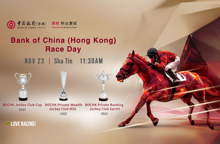 Ten races are programmed for the day at Sha Tin, with the spotlight on three Group 2 contests, each offering HK$5.35 million in stakes: BOCHK Jockey Club Cup (2000m), BOCHK Private Wealth Jockey Club Mile (1600m) and BOCHK Private Banking Jockey Club Sprint (1200m).