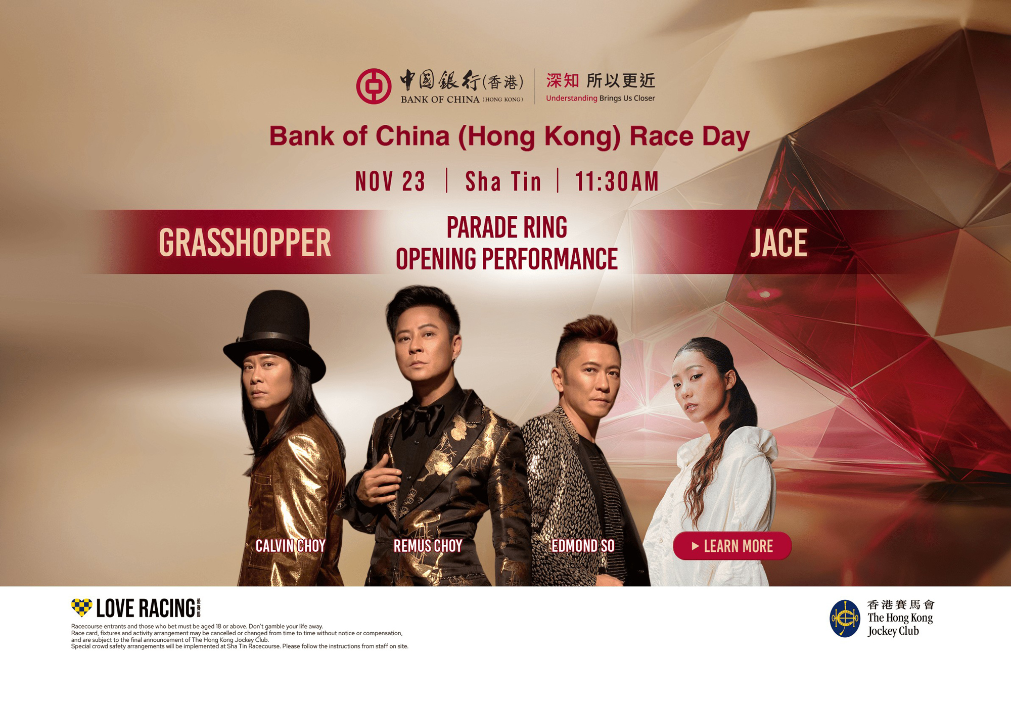 The Bank of China (Hong Kong) Race Day features an opening performance in Sha Tin’s Parade Ring, scheduled for 11.30am, by Grasshopper and singer Jace Chan, who will ensure the event gets off to a lively start! #