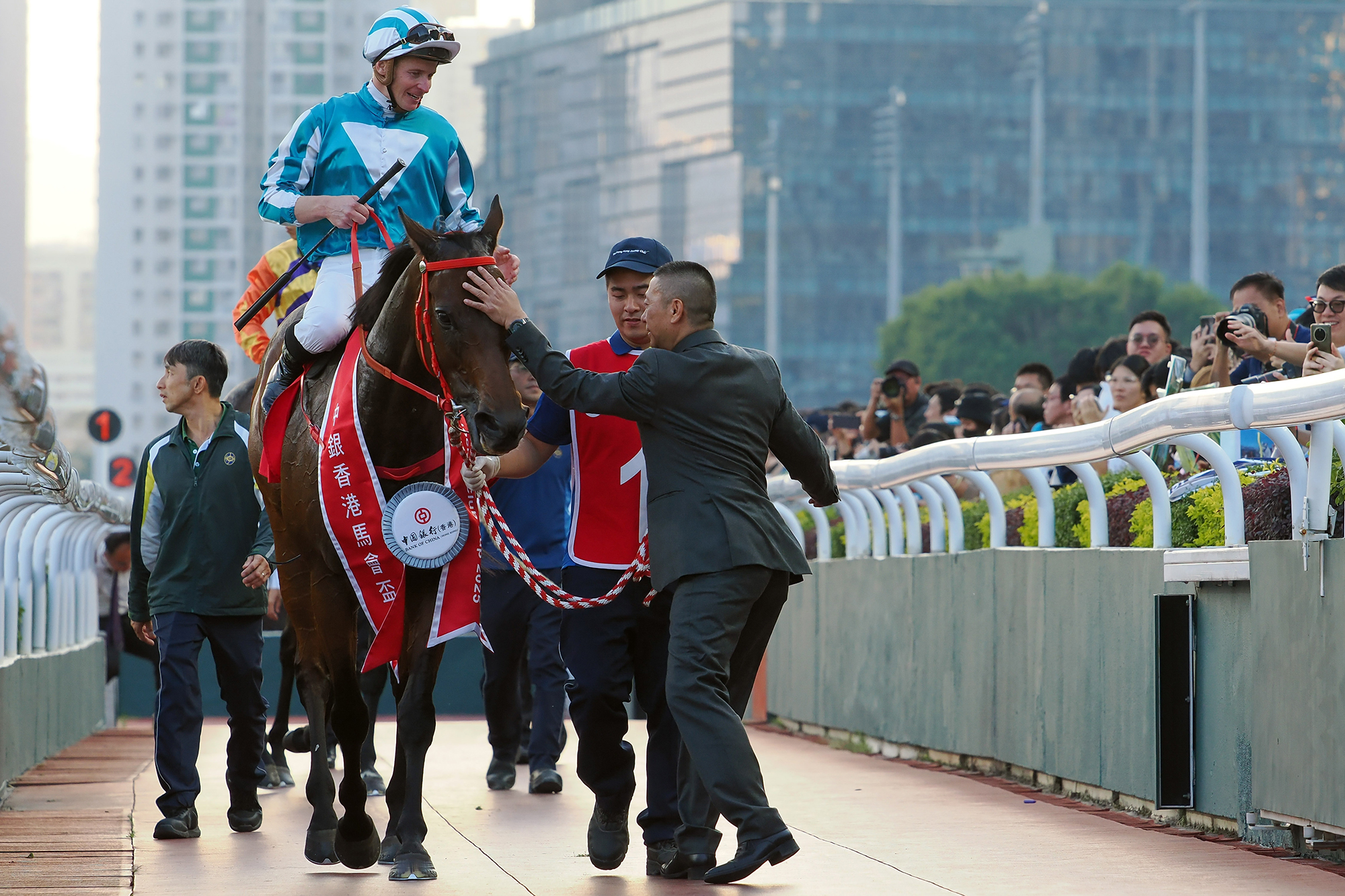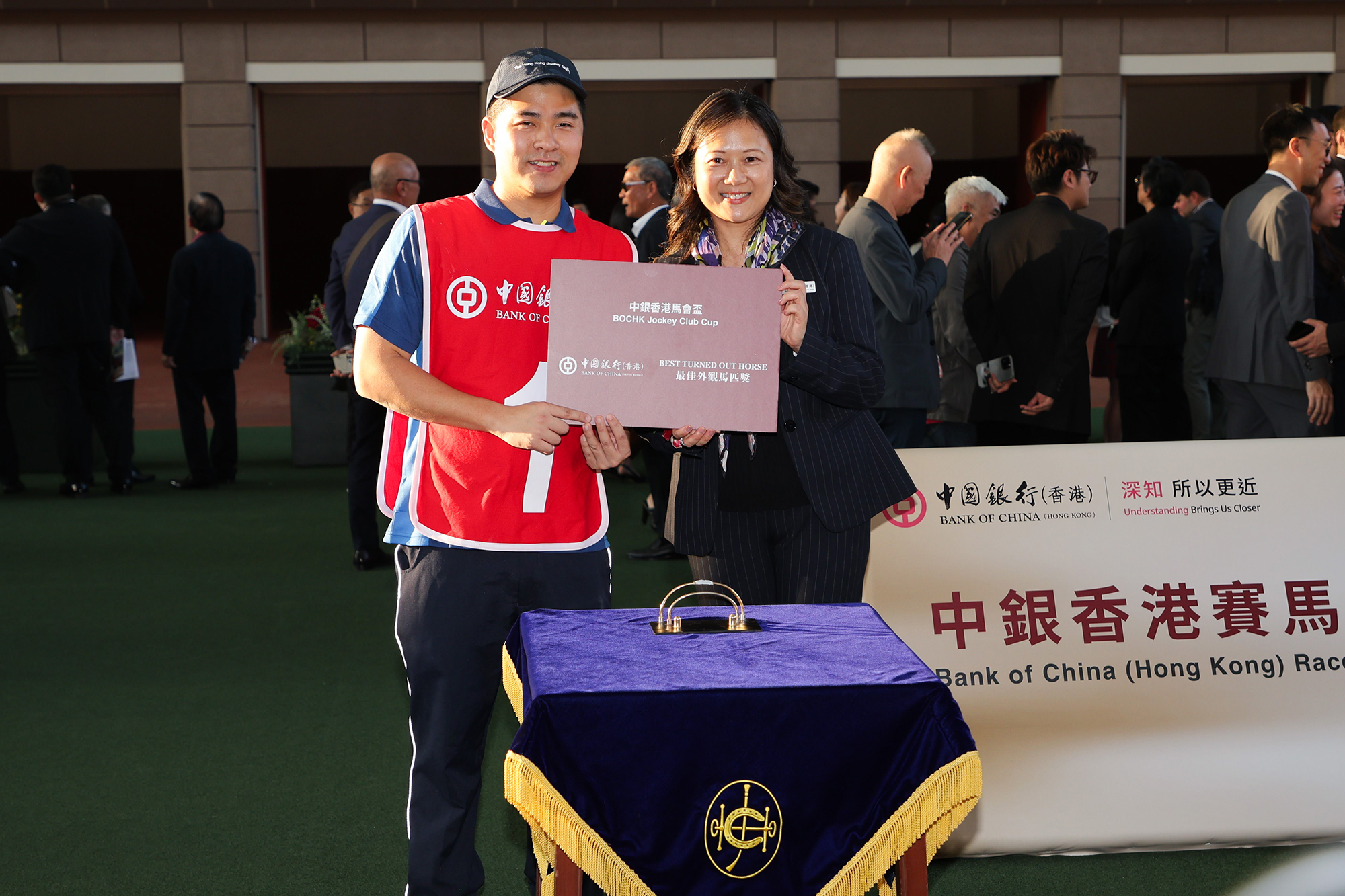 Before the race, Elsie Gung, Deputy General Manager of Personal Banking and Wealth Management Department, Bank of China (Hong Kong) Limited, presents a prize at the parade ring to the stable assistant responsible for Romantic Warrior, the “Best Turned Out Horse” in the BOCHK Jockey Club Cup.